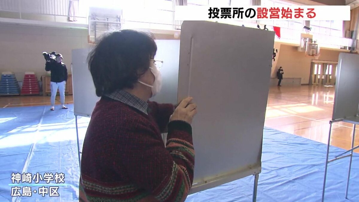 管内の有権者数が1万人を超える広島市中区の神崎小学校では、市の職員など12人が設営作業を行いました。