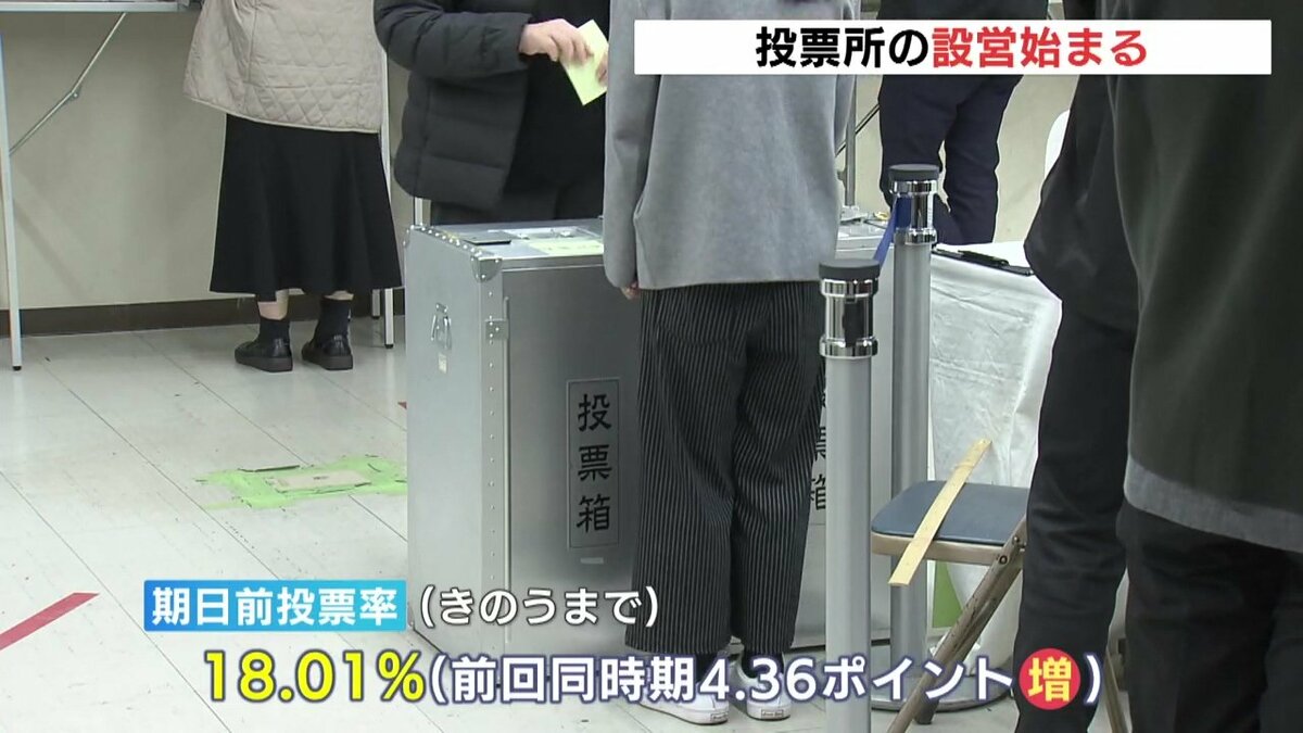 また、7日午後8時までは期日前投票も行われていて、6日までの投票率は18.01%でした。前回の衆院選の同じ時期より4.36ポイント上昇しています。