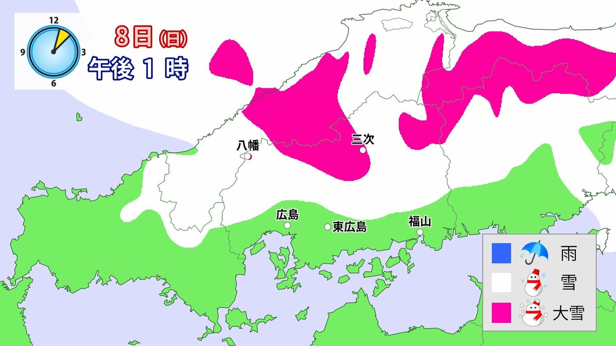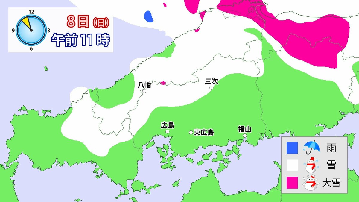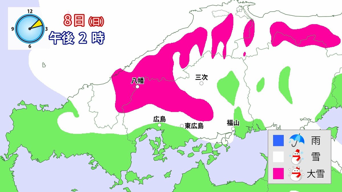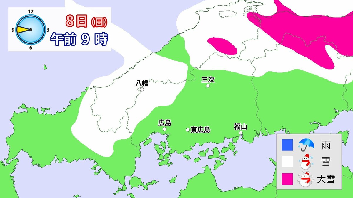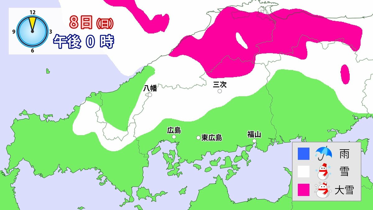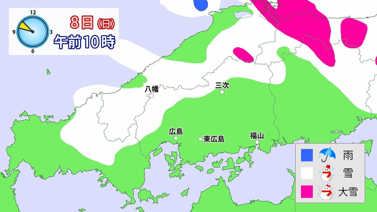 気象庁によりますと、広島県では、8日は降雪が強まり、普段雪の少ない南部の平地も含めた広い範囲で大雪となる見込みです。雪雲が予想より発達し、同じ場所で降り続いた場合には、警報級の大雪となる可能性があります。夜遅くにかけて積雪や路面の凍結による交通障害に十分注意してください。