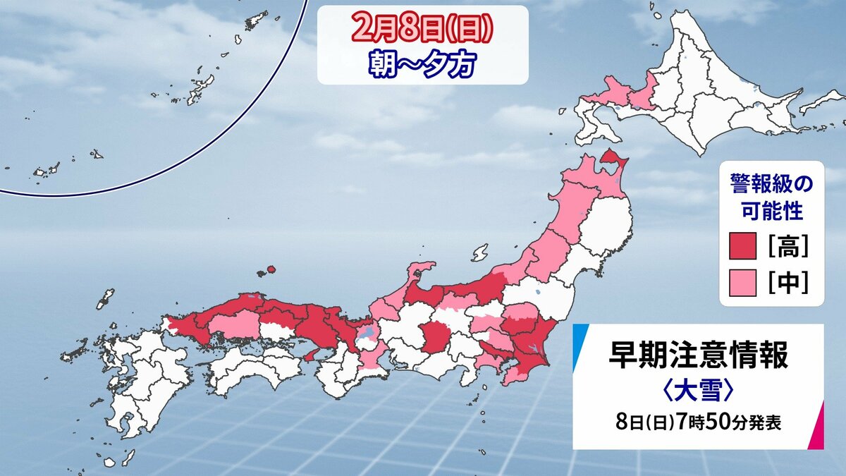 普段雪の少ない南部の平地でも積雪の見込み