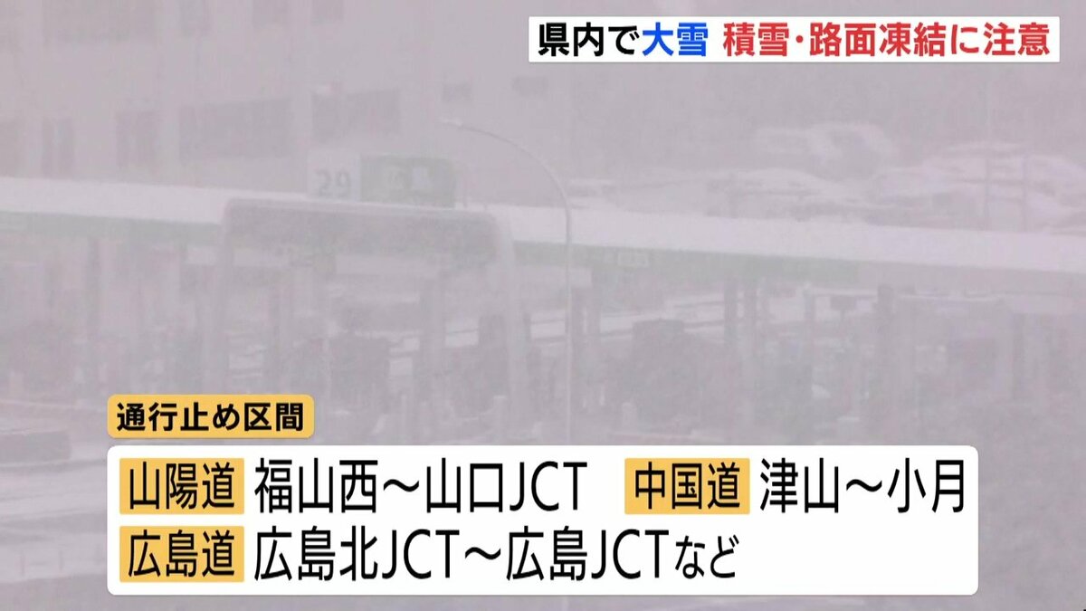 現在、中国地方の高速道路は、山陽道の福山西ICから山口JCT間など広い範囲で通行止めとなっています。雪道は必ず冬用タイヤを装着し、無理な運転は控えるようにしてください。