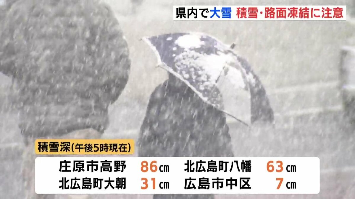 現在、広島県の上空には非常に強い寒気が流れ込んでいて、庄原市と三次市では大雪警報が発表されています。また普段、雪が少ない南部の平地でも積もっています。