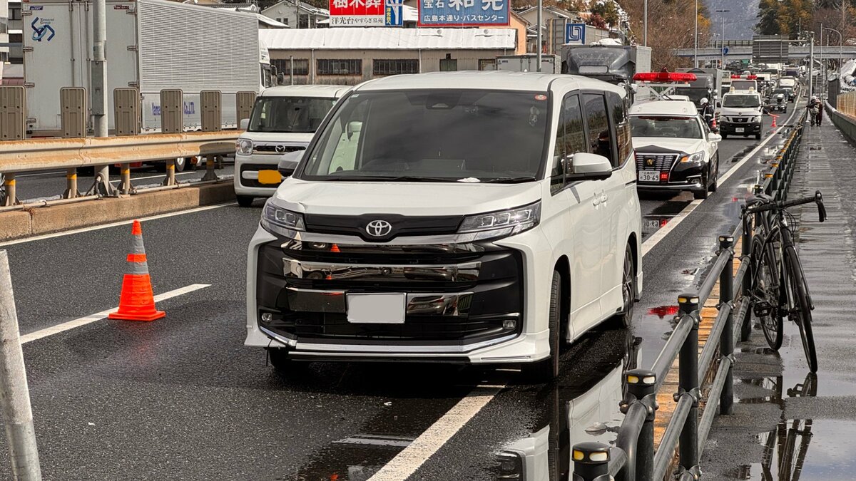 西向きに右側の車線を走行していた普通乗用車が車線変更のためハンドルを左にきった際、操作を誤り左側の車線で止まっていた別の普通乗用車に接触、その後、前方に止まっていたバイクやほかの普通乗用車に玉突き事故を起こし、計4台が絡む事故になりました。