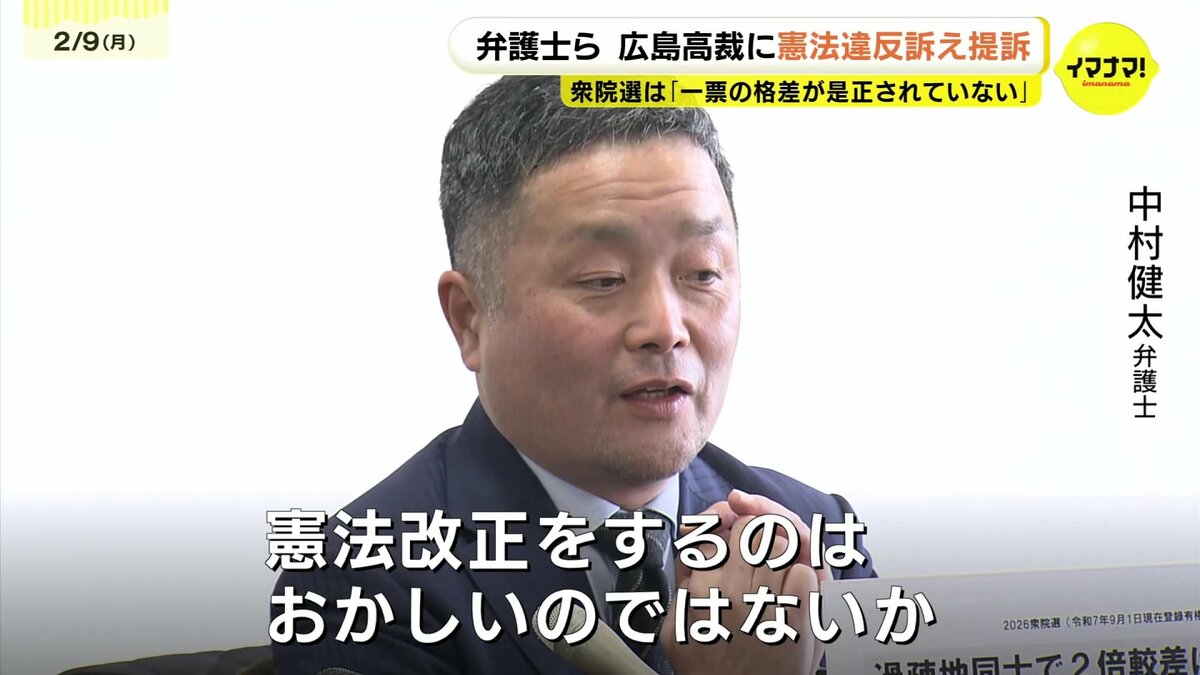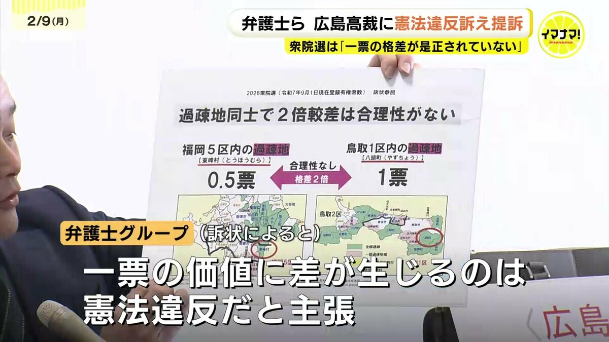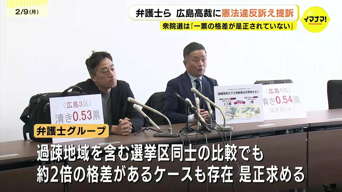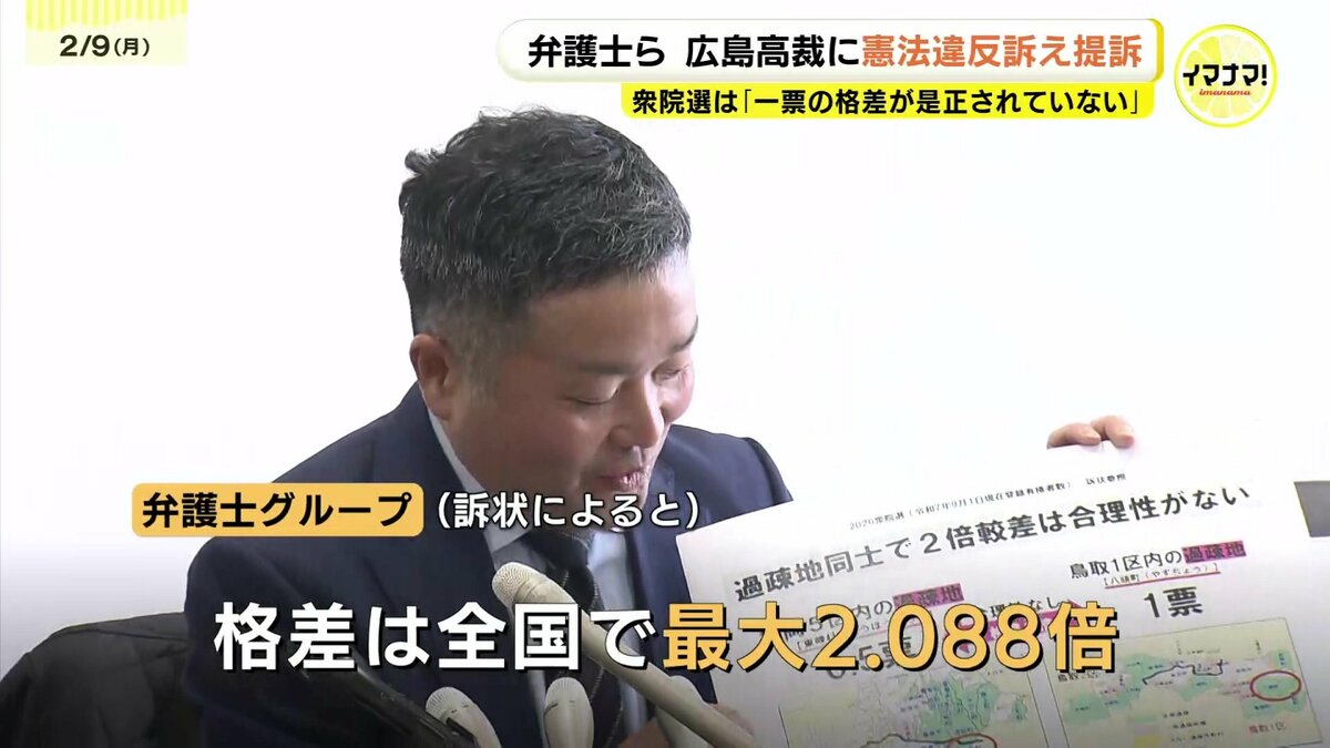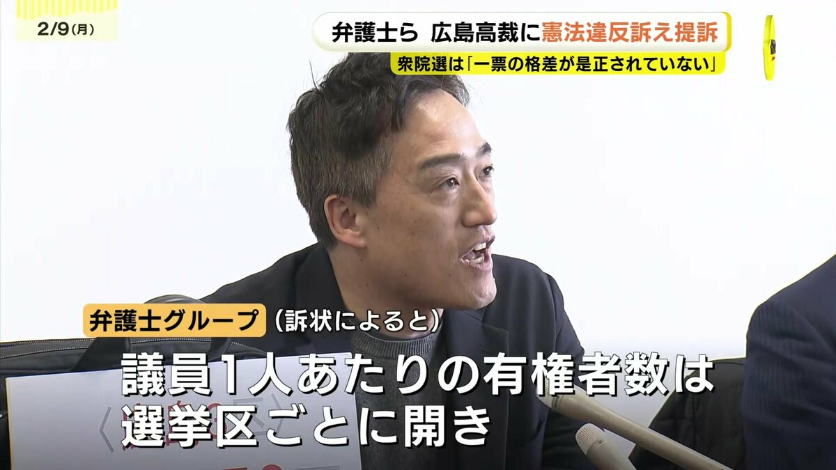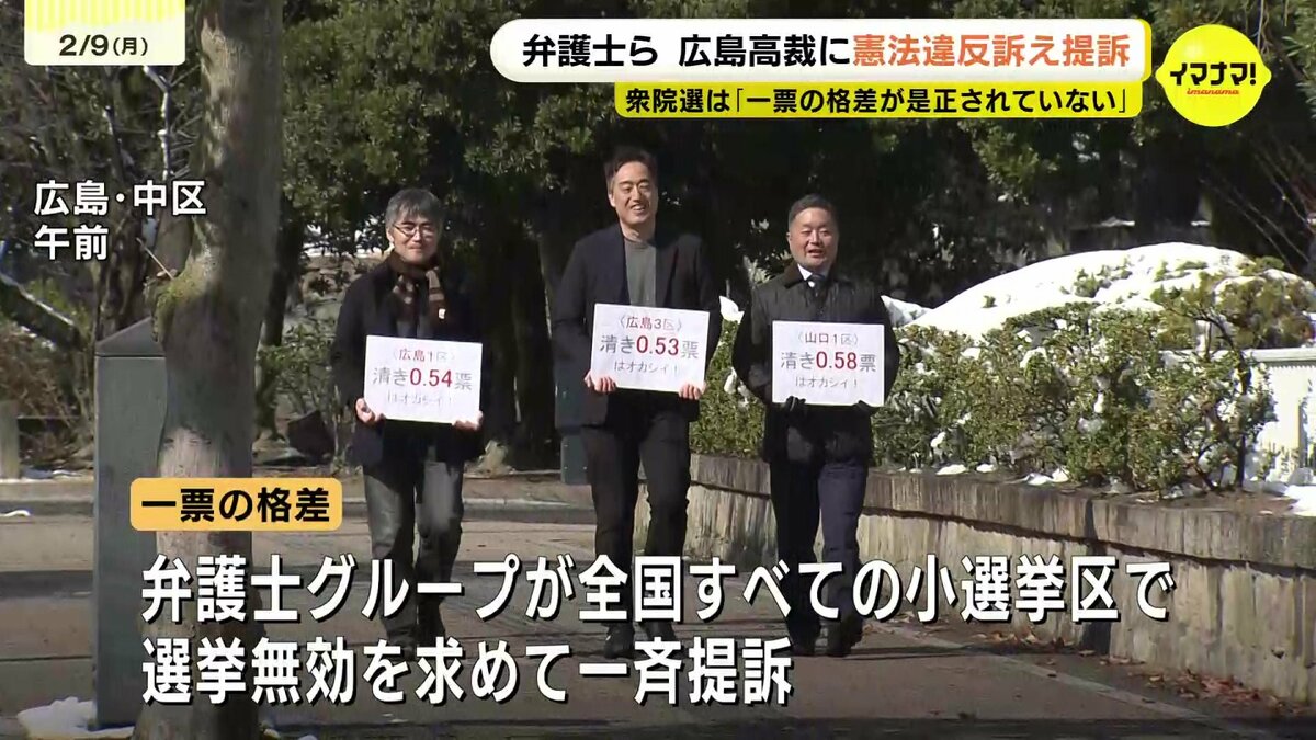 「一票の格差」をめぐっては弁護士グループが全国すべての小選挙区で、選挙の無効を求めて一斉提訴しています。このうち広島高裁には広島県と山口県9つの小選挙区の選挙無効を訴えています。訴状によりますと議員1人あたりの有権者数は選挙区ごとに開きがあり、格差は全国で最大2.088倍。一票の価値に差が生じるのは憲法違反だと主張しています。