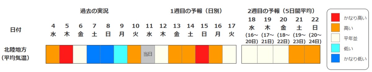 北陸地方の向こう2週間の気温は、寒気の影響を受けにくいため高い日が多く、15日頃からはかなり高くなる可能性があります。