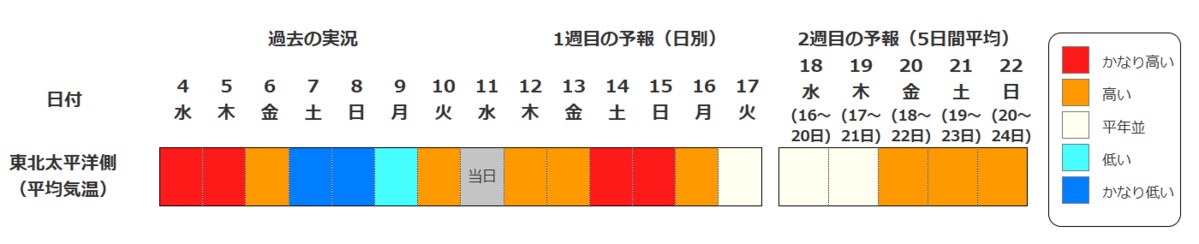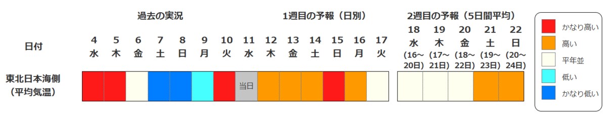 東北地方の向こう2週間の気温は、寒気の影響を受けにくいため高く、15日頃からはかなり高くなる可能性があります。