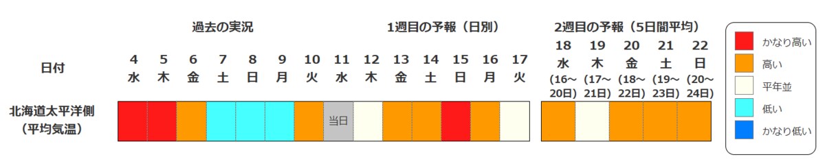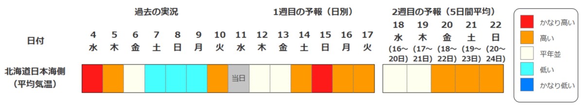 北海道地方の向こう2週間の気温は、寒気の影響を受けにくいため高い日が多く、15日頃からはかなり高くなる可能性があります。