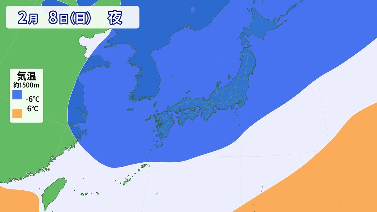 上空1500m付近の空気を見ると、大雪となった8日は、-6℃以下の真冬の寒気が日本列島をすっぽり覆っていましたが、15日の予想では、寒気は北海道まで北上し、南から春の空気が入っています。1週間でかなりの気温差が予想されます。