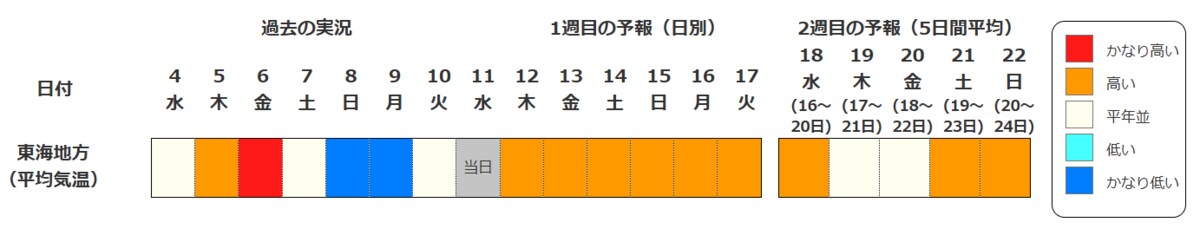 東海地方の向こう2週間の気温は、寒気の影響を受けにくく暖かい空気が流れ込みやすい時期があるため高い日が多く、15日頃からはかなり高くなる見込みです。