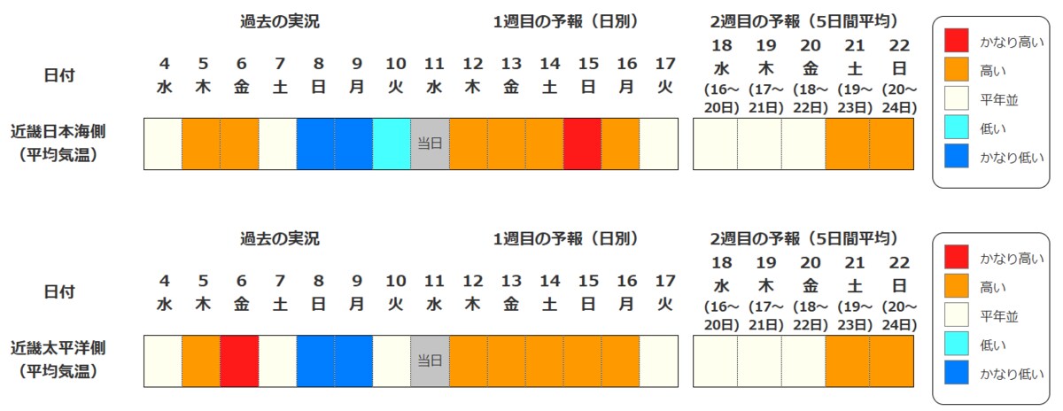 近畿地方の向こう2週間の気温は、寒気の影響を受けにくく暖かい空気が流れ込みやすい時期があるため高い日が多く、15日頃からはかなり高くなる見込みです。