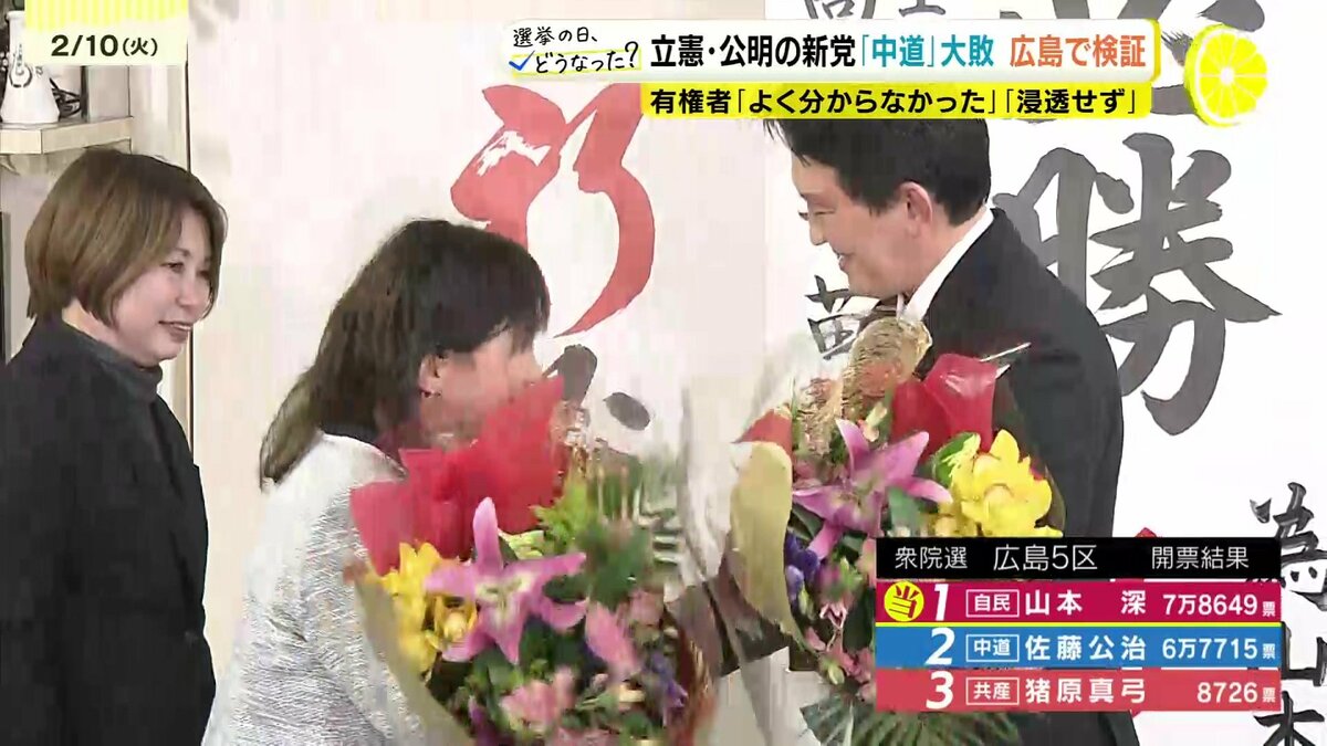 一方、こちらは広島5区。6期目の当選を目指した中道の佐藤公治氏も敗れました。RCCの出口調査では公明支持層をほぼ完全に固めていたとみられています。