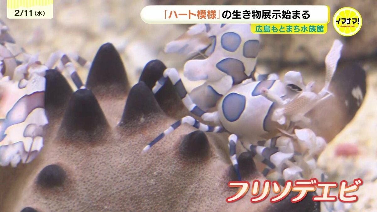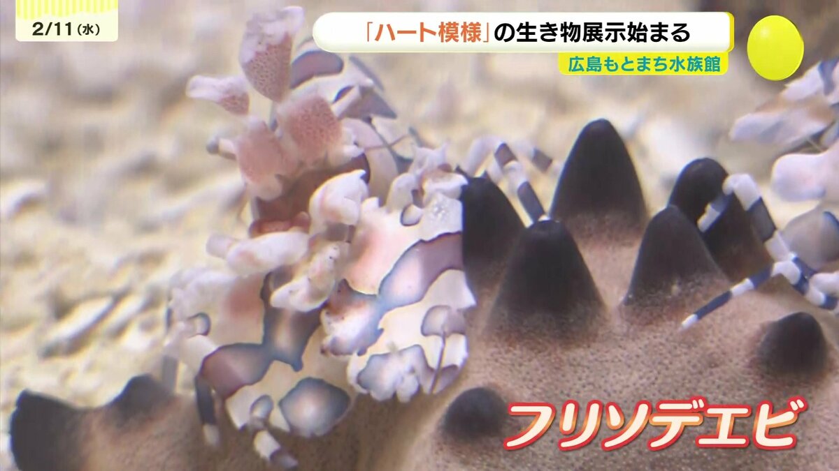 広島市中区の「広島もとまち水族館」入り口で、11日から始まった企画展示は、「恋する海のバレンタイン」です。水槽の中で優雅に動くのは、体長4センチほどの「フリソデエビ」です。大きく広げたハサミ脚が着物の「振袖」に見えることからその名がつきました。注目はその背中。鮮やかなピンクや紫色の斑点の中に、くっきりと「ハートの模様」があるのが分かります。