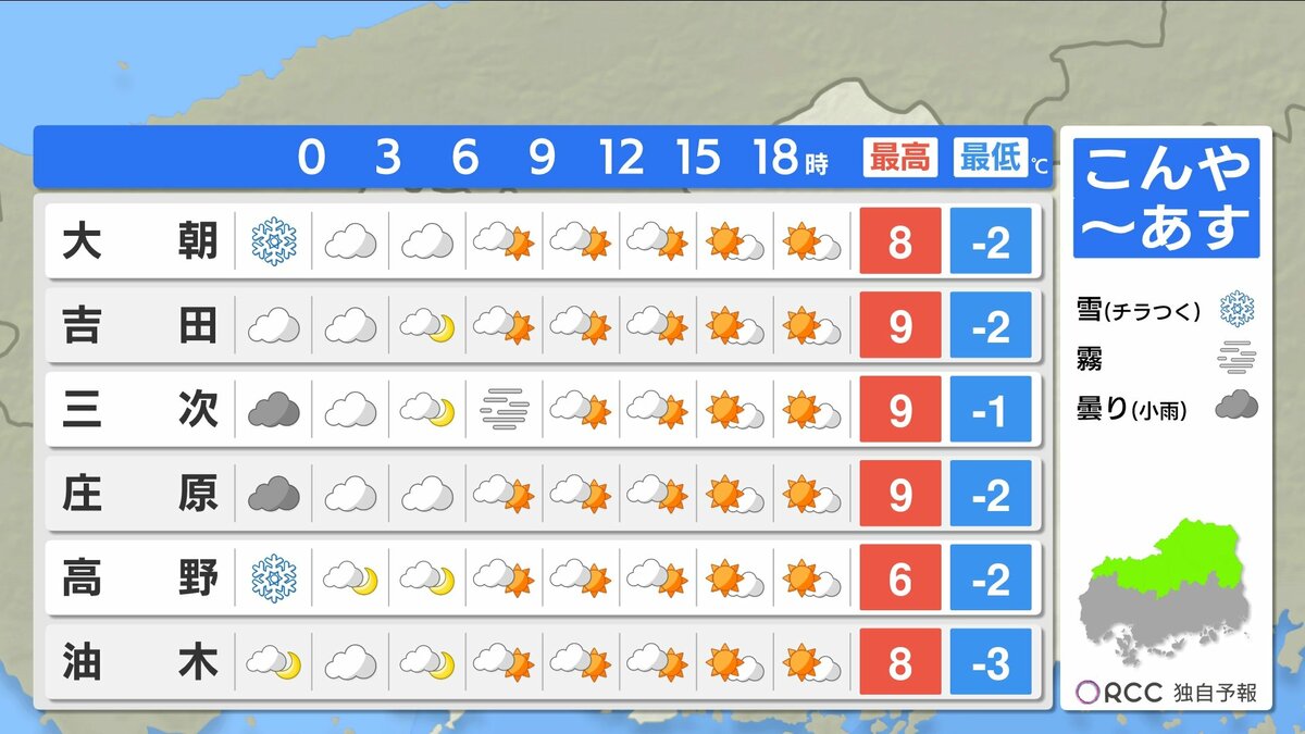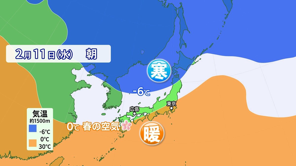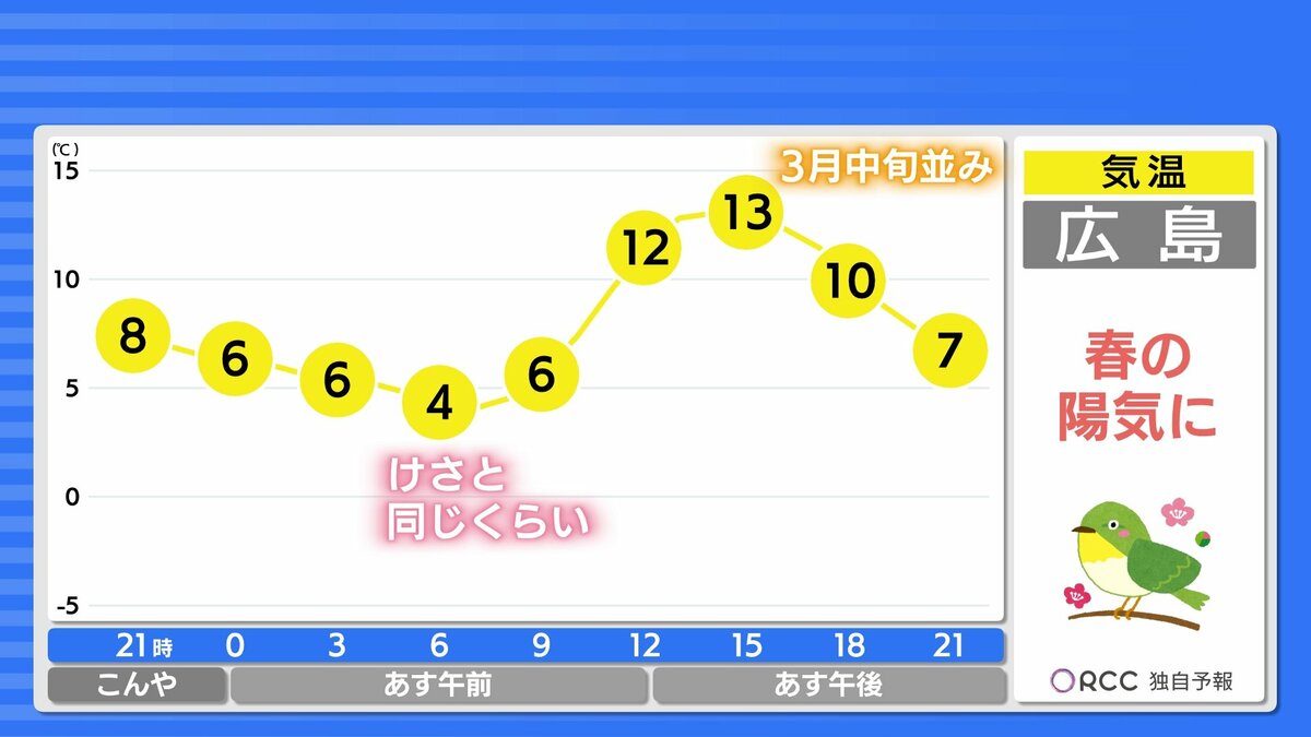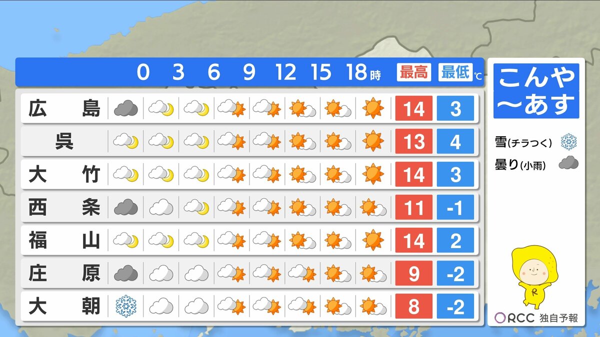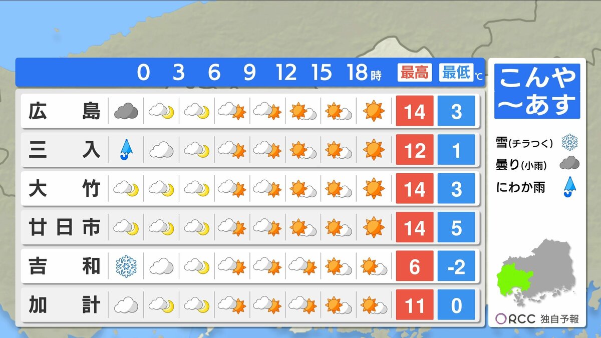 きょう2月11日(水)の広島県内は、朝まで本降りの雨となり、午後も一部にわか雪やにわか雨の地点がありました。午後は次第に回復し、沿岸部を中心に日差しも届きました。
