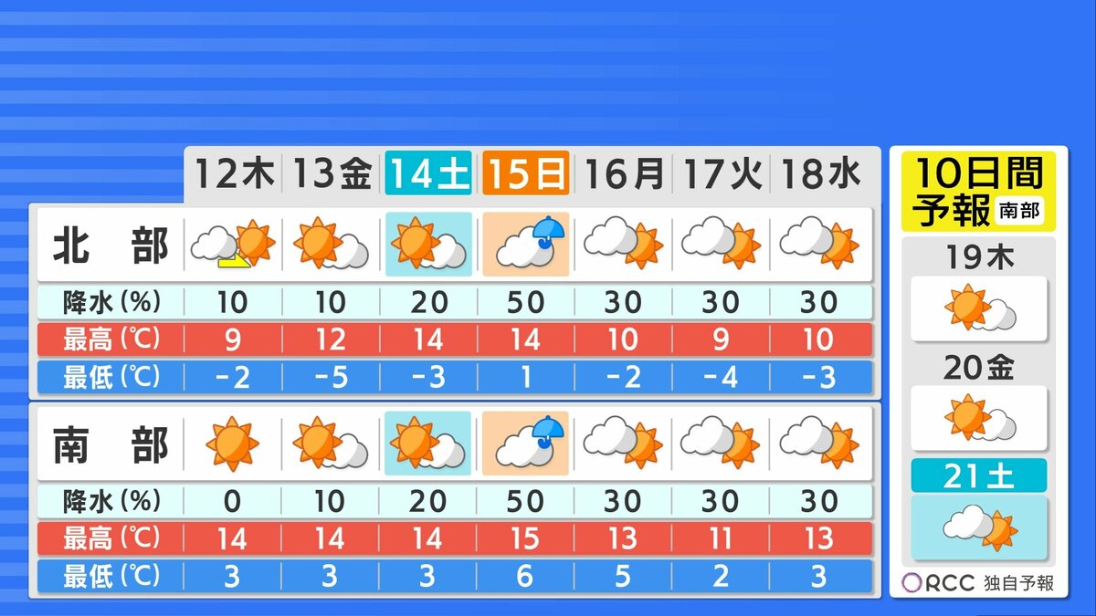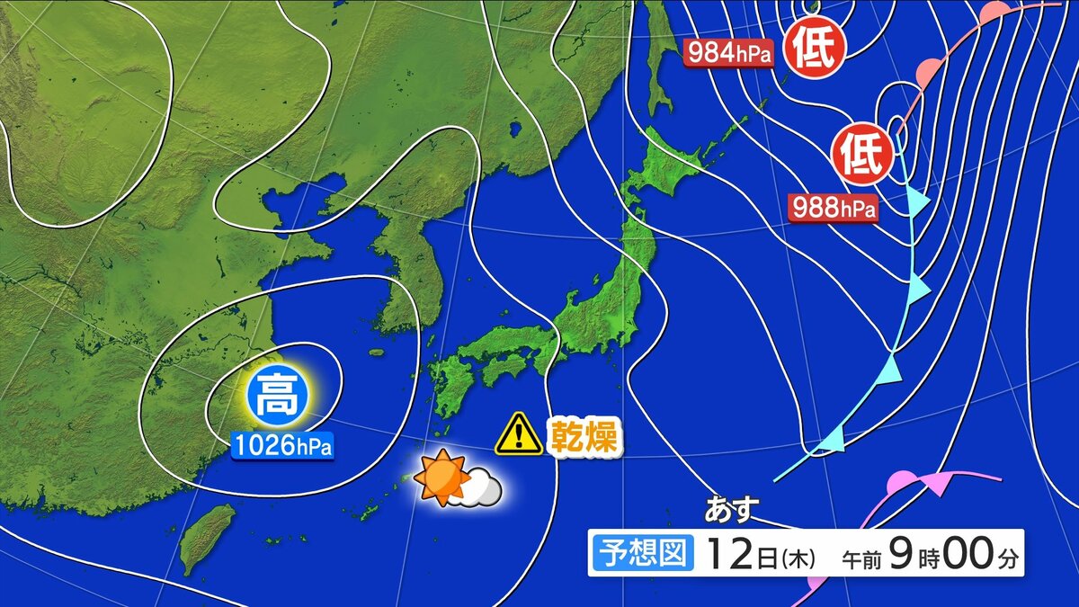 12日(木)午後ほど安定して晴れる 日中ぽかぽか陽気に 空気の乾燥に注意