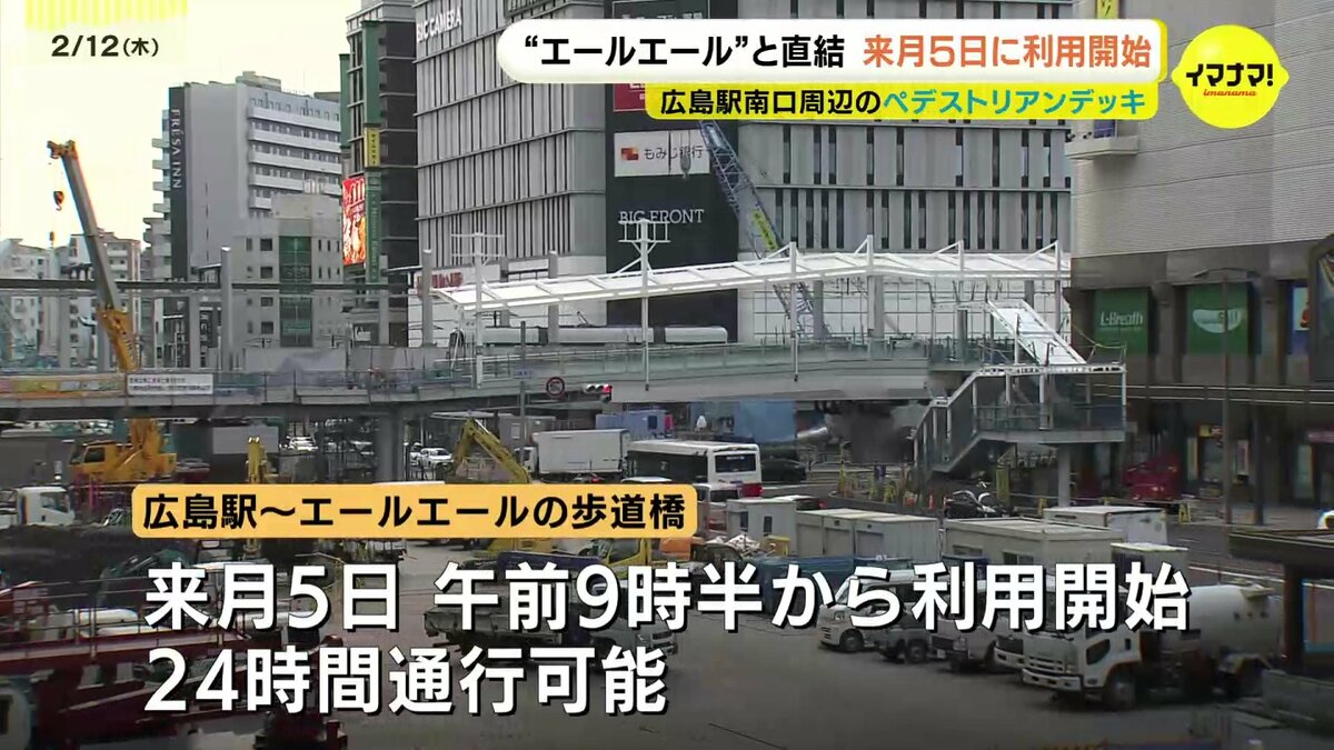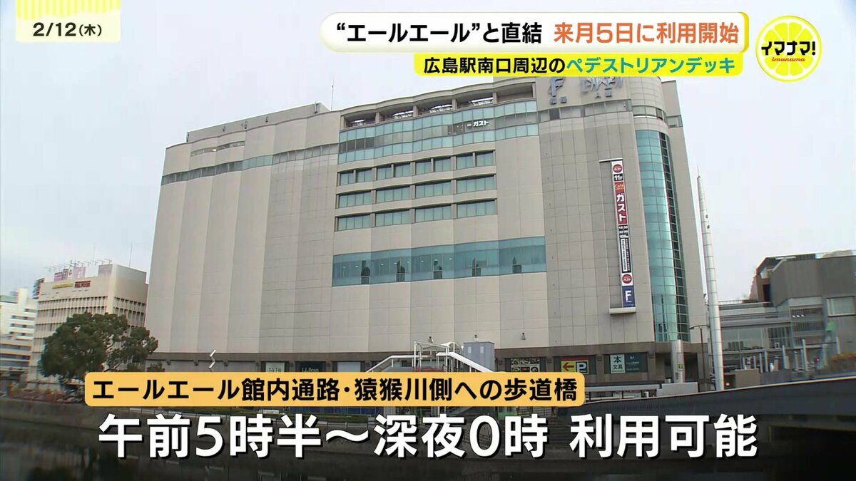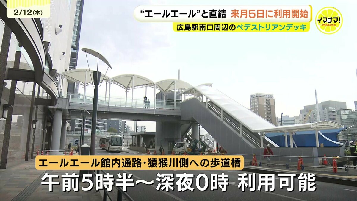 広島市は、新しい広島駅ビルとエールエールの2階をつなぐ歩道橋=ペデストリアンデッキが、来月5日の朝から利用できるようになると発表しました。