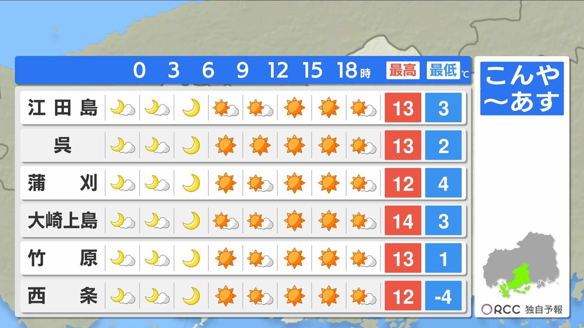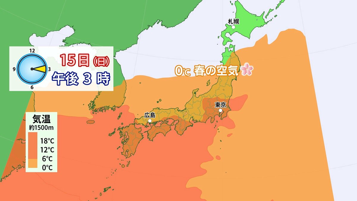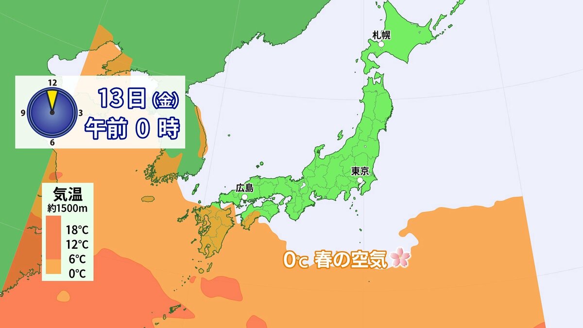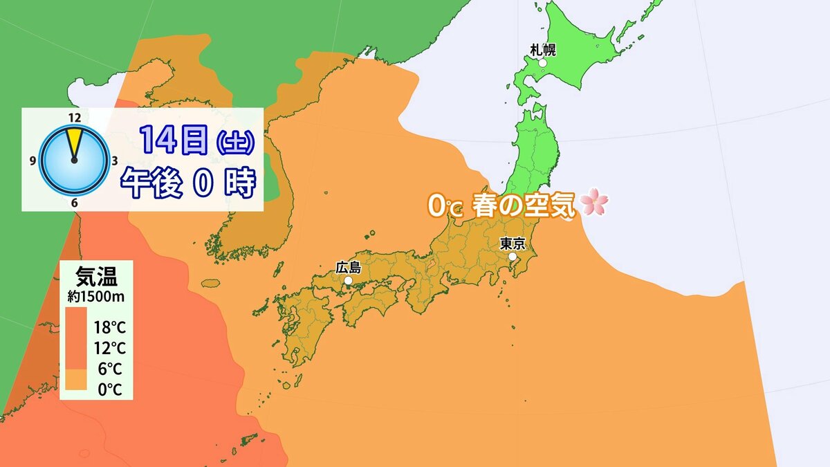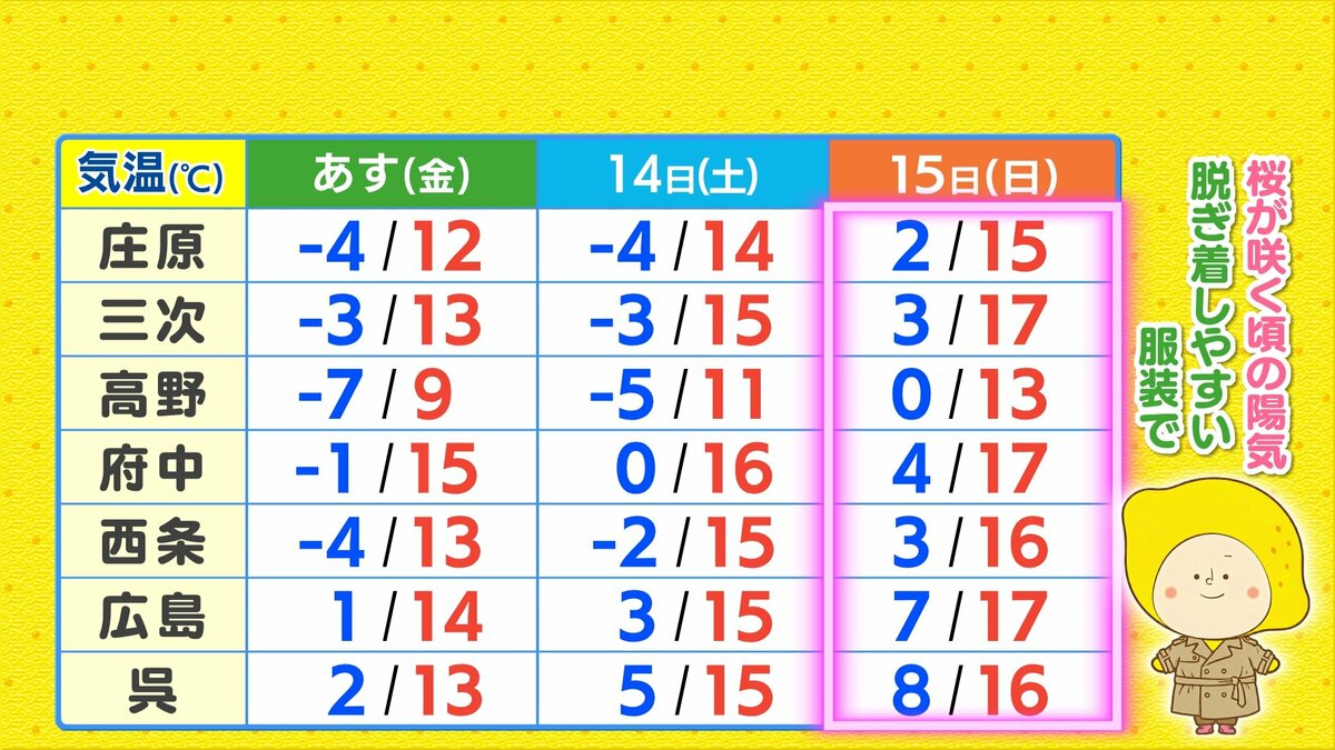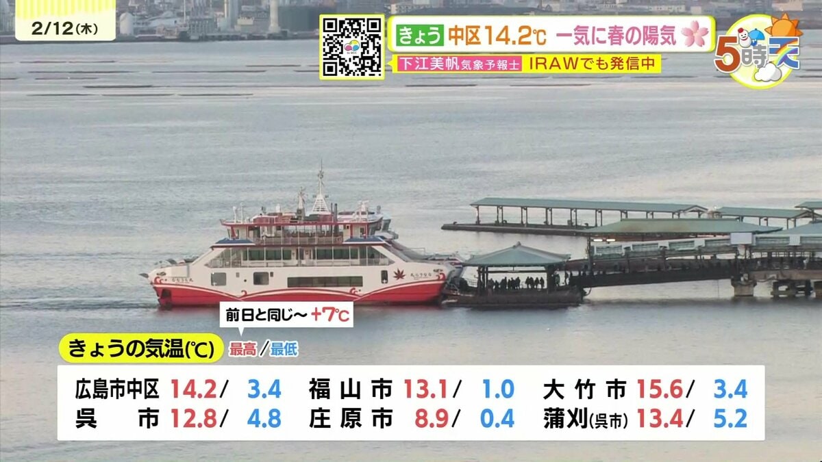 きょう2月12日(木)の広島県内は、午後ほどよく晴れて一気に春の陽気になりました。最高気温は、大竹で15.6℃ 広島市中区で14.2℃まで上がり、各地2月下旬から3月下旬並の暖かさになりました。