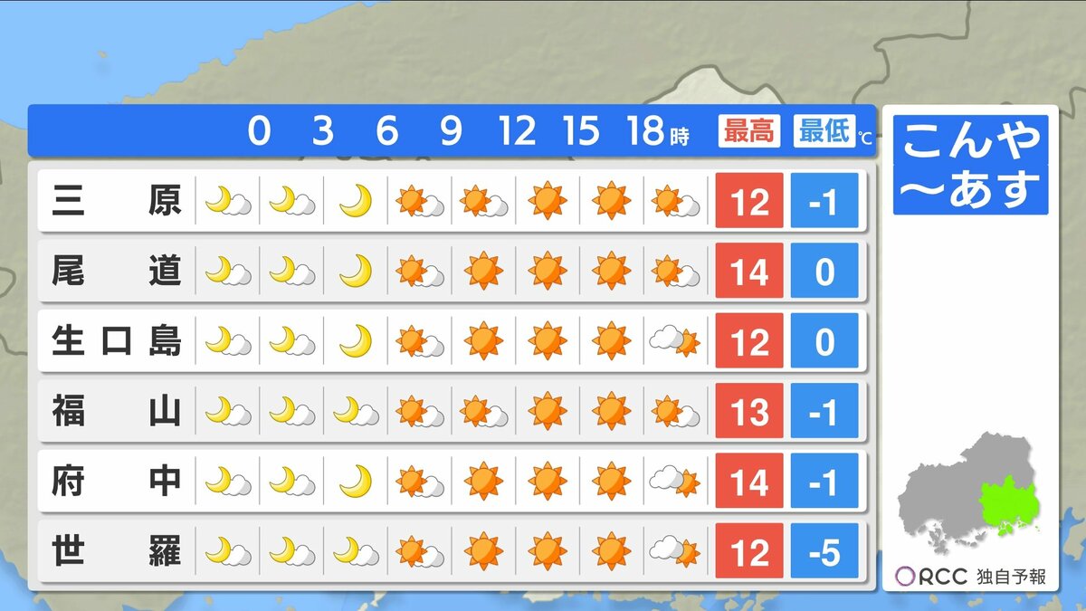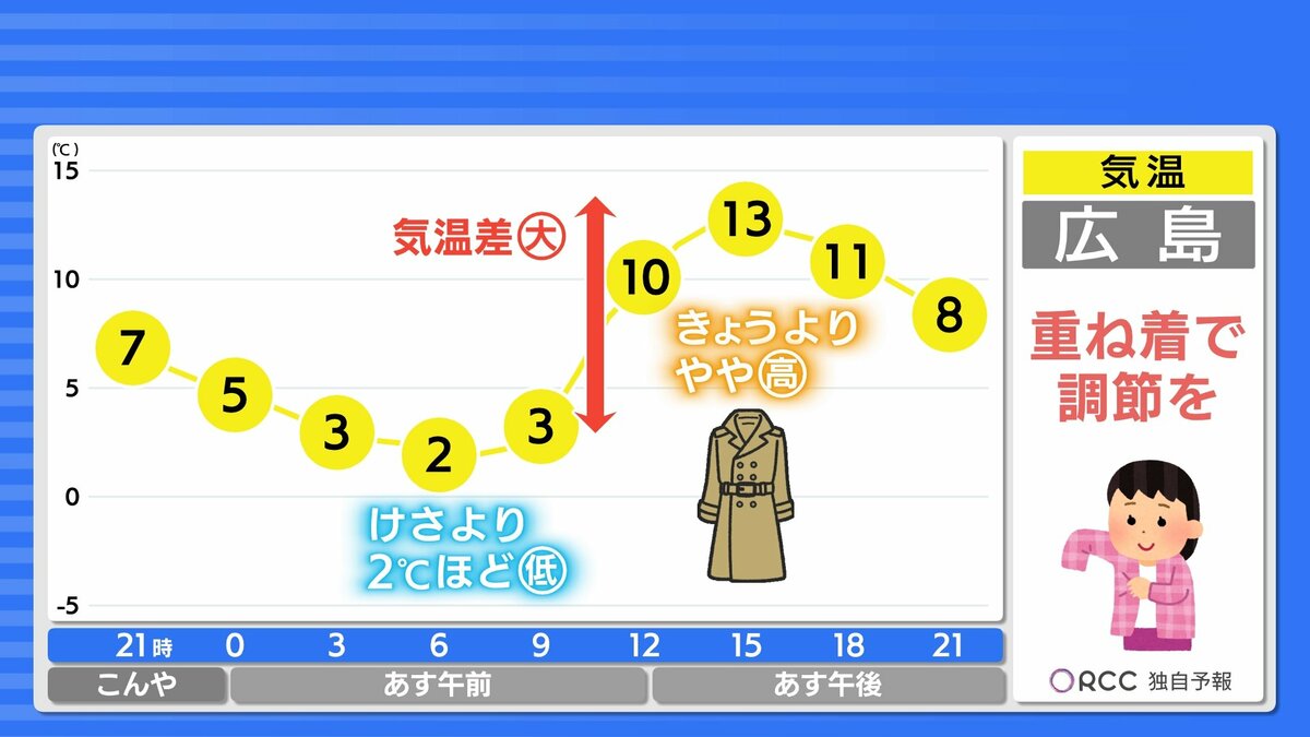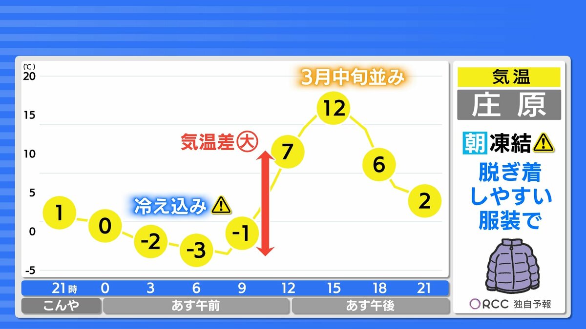 晴れる分放射冷却が効き、あすの朝の冷え込みはさらに強まります。北部や内陸部を中心に-5℃前後まで冷え込むでしょう。日中の気温は大幅に上昇し、沿岸部で13℃~15℃まで上がり、あすも春の陽気が続きます。一日の寒暖差がかなり大きいですので、脱ぎ着しやすい服装でお過ごしください。