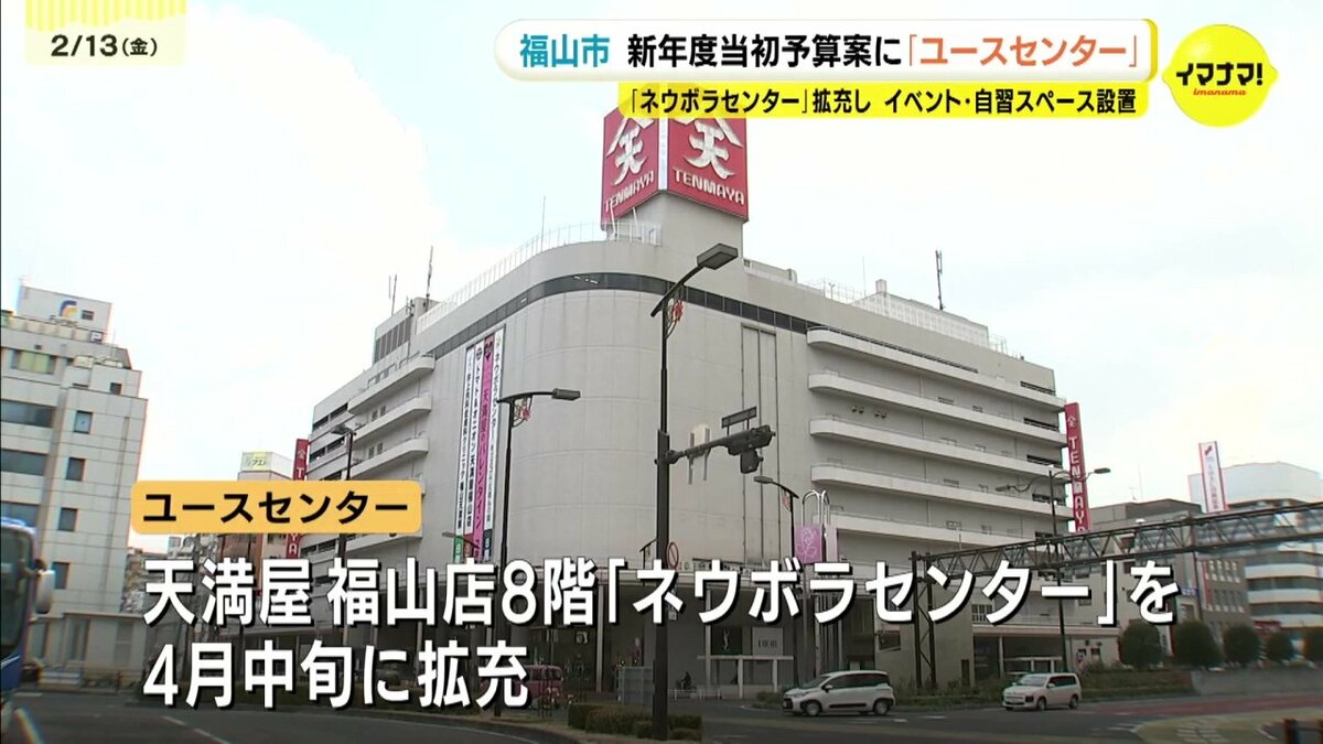 主な事業では、天満屋福山店8階に入る「ネウボラセンター」を4月中旬に拡充し、若者の居場所「ユースセンター」を7階に開設。その運営費に約490万円を計上しています。イベントや自習などに使えるスペースを設けます。