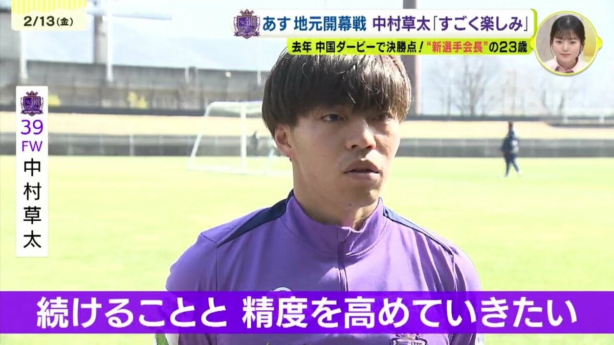眩しい日差しの元おこなわれた前日練習。キャンプ中にケガをしていたDF荒木が全体メニューに加わり戦力が整いつつあります。14日(土)の地元開幕戦は去年から始まった中国ダービー。1勝1敗で3度目の対決を迎えますが勝利した試合で決勝点を挙げたのが、中村草太です。