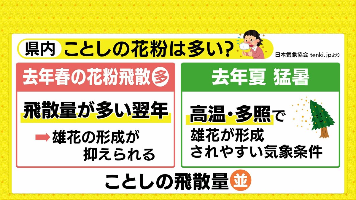 ただ、花粉の飛散量は昨夏の気温によっても左右されます。昨年の夏も猛暑が続きました。昨夏に高温多照の傾向が続いたことで、雄花が形成されやすい気象条件となっています。すなわち、県内の今年の花粉飛散量はおおむね平年並になる見込みです。