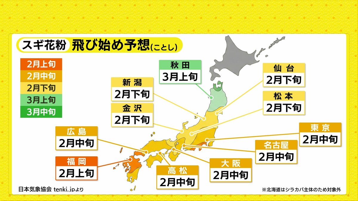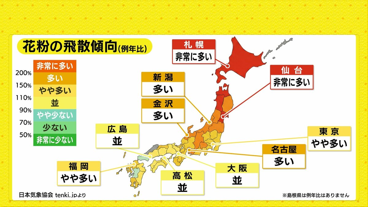 県内では2月中旬頃から花粉の飛散が開始する見込みで、広島県の今年の傾向は平年並と予想されています。全国的に見ると、今年は東日本・北日本で飛散量が多くなるという見通しです。(日本気象協会より)