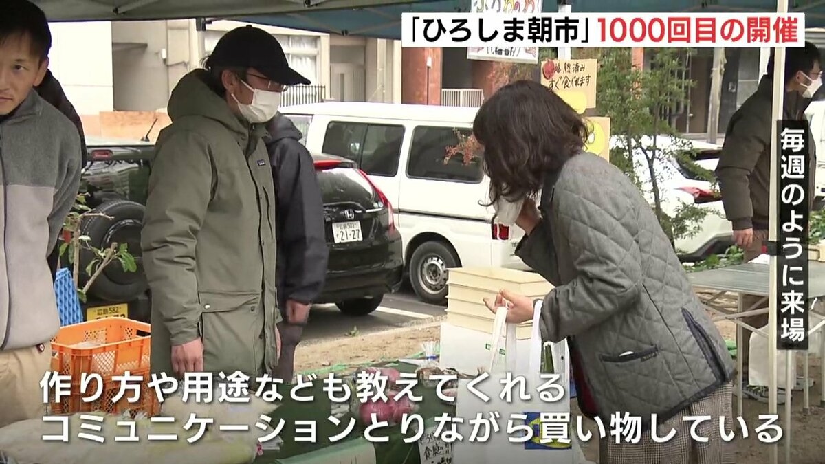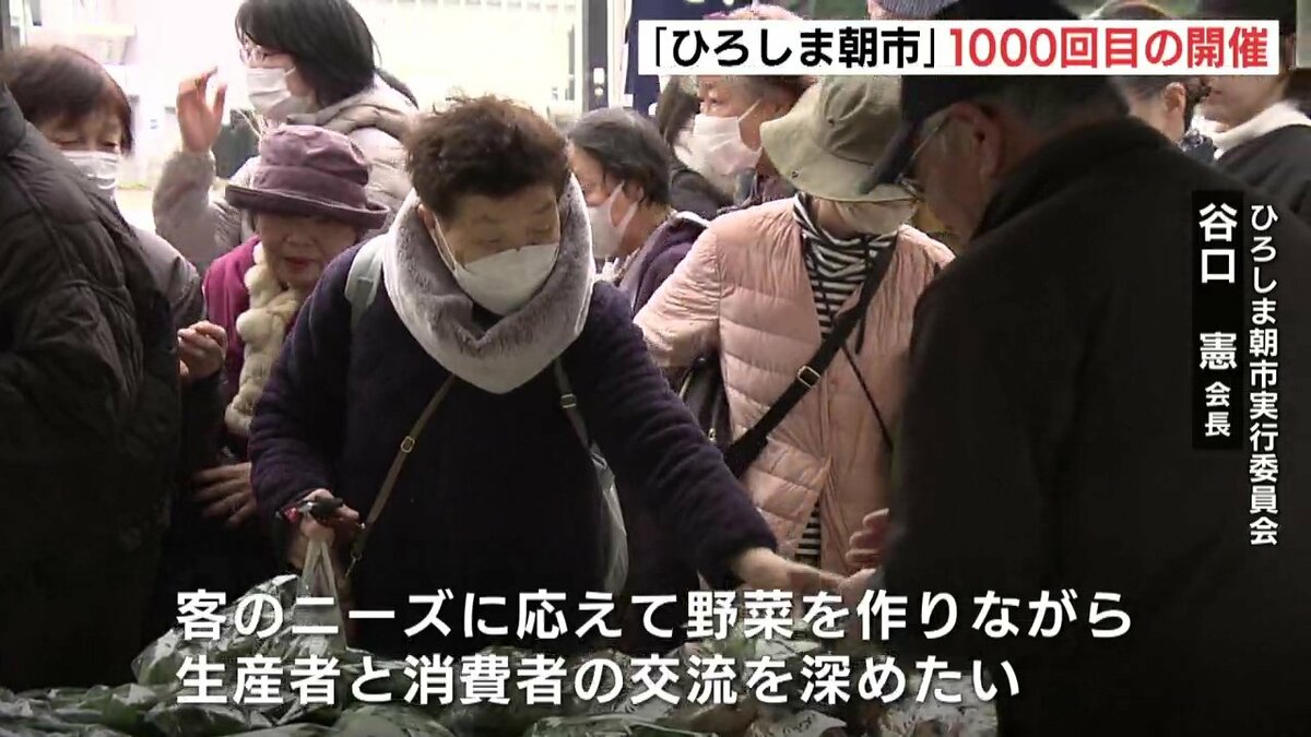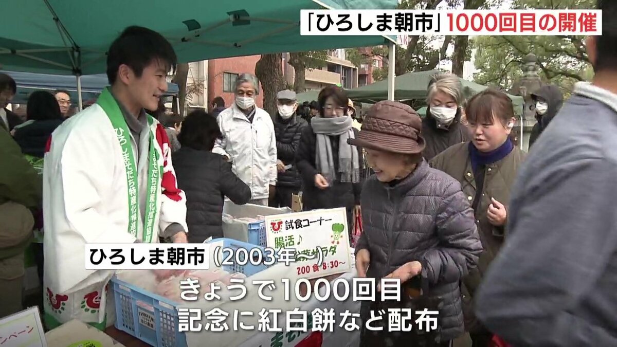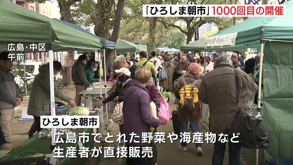 広島市の平和大通り緑地帯で毎週開かれている、広島市内でとれた野菜や海産物などを生産者が直接販売する催し「ひろしま朝市」が1000回目の開催を迎えました。