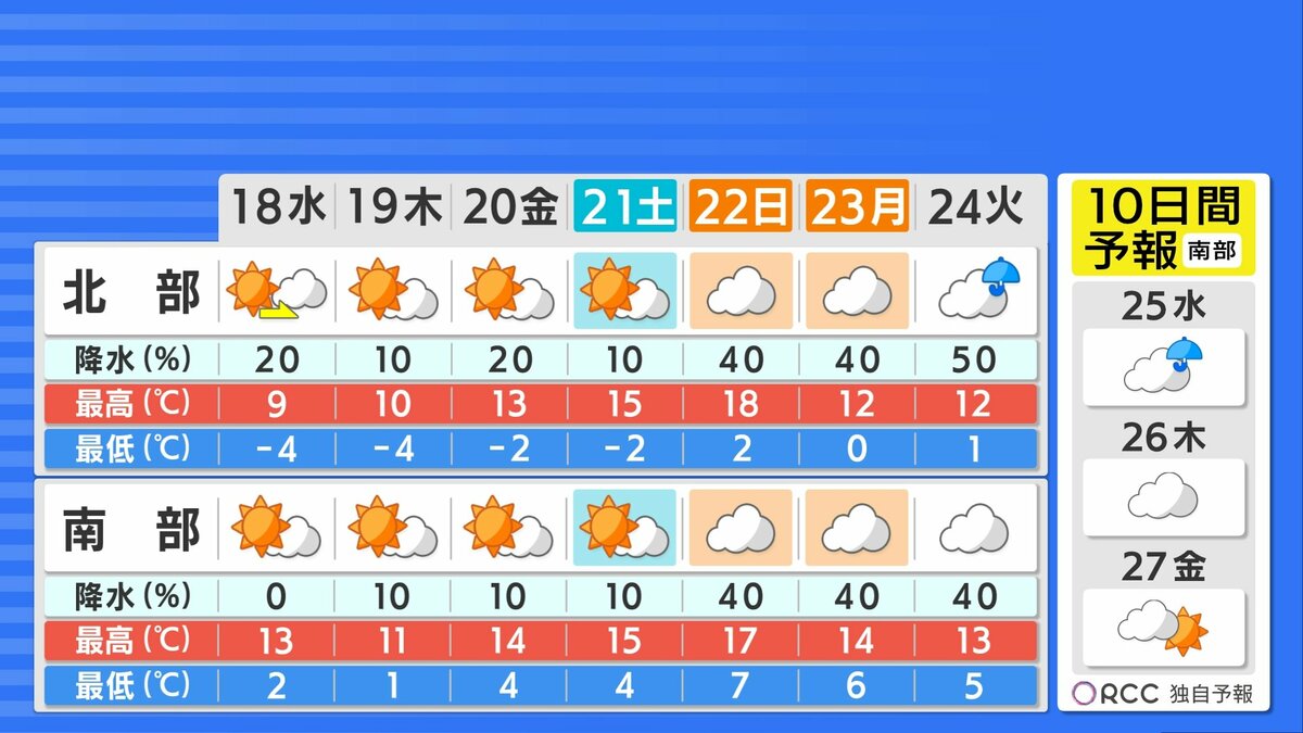 18日(水)おおむね晴れ 北部は雲優勢 北風が冷たい一日
