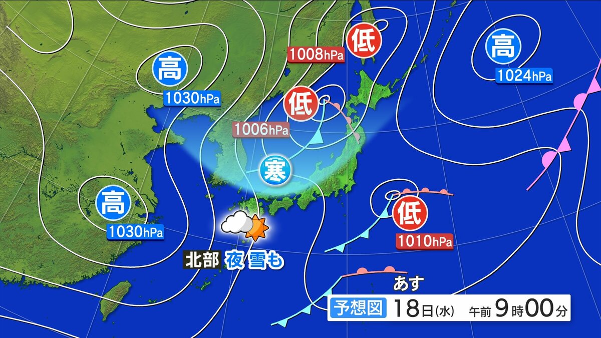 あすも基本的には高気圧の圏内でおおむね晴れますが、次第に冬型の気圧配置に変わり、寒気の影響で北部ほど雲が広がりやすくなるでしょう。夜には一部にわか雪の地点がある見込みです。