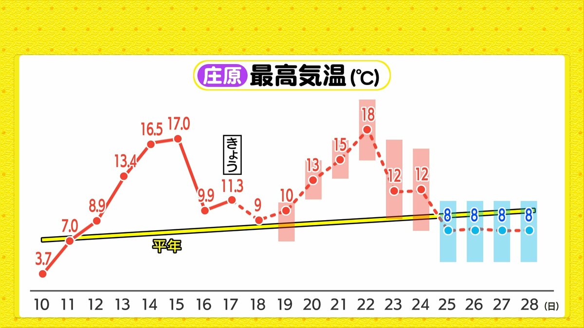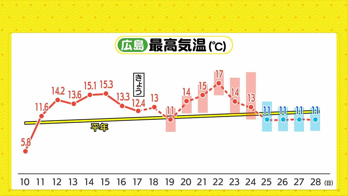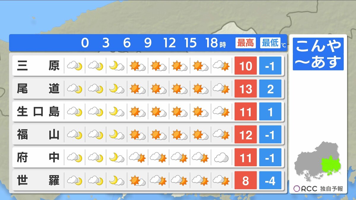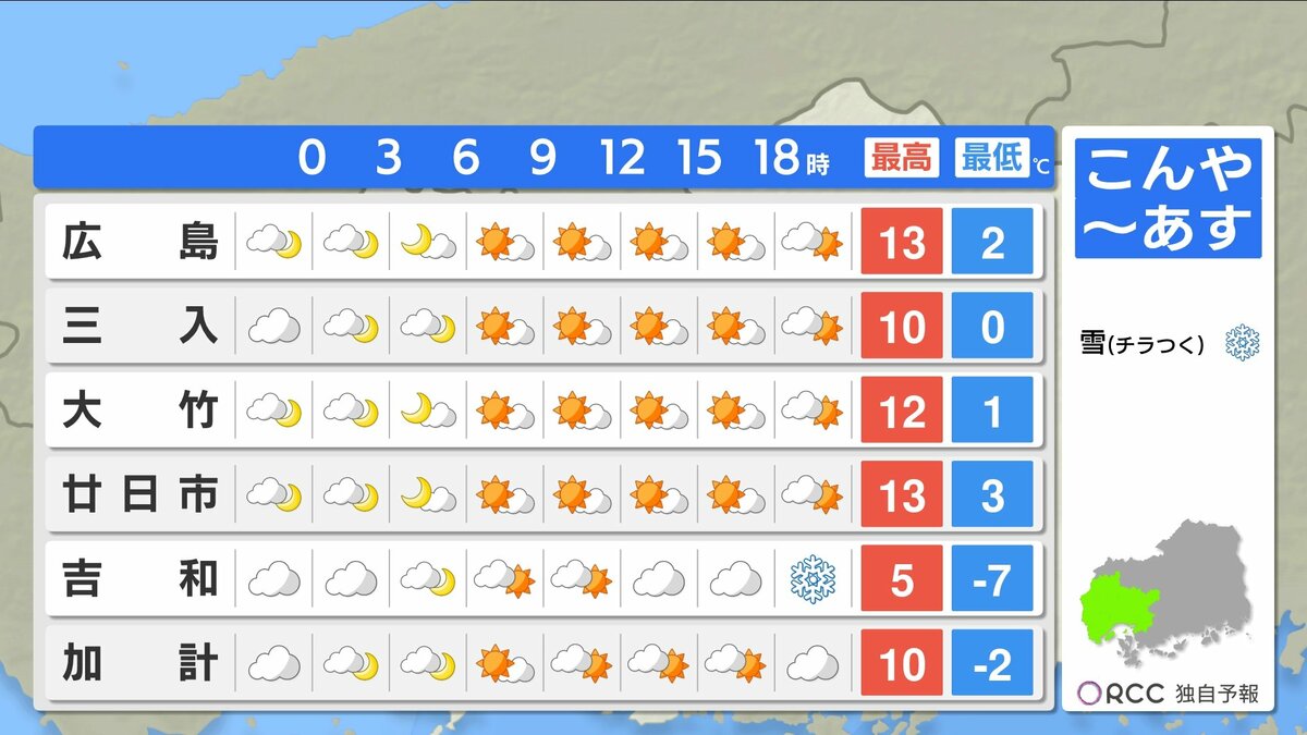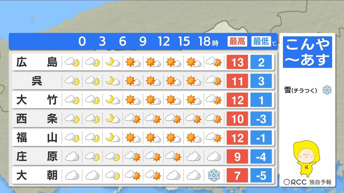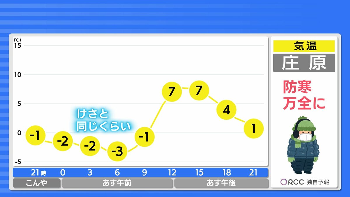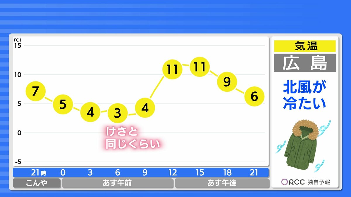 朝の冷え込みはけさと同じくらいでしょう。日差しのぬくもりもありそうですが、日陰では寒さを感じるでしょう。また、あすは冬型の気圧配置になり、北風が吹くため数字以上に寒さを感じるかもしれません。風を通しにくい服装でお過ごしください。