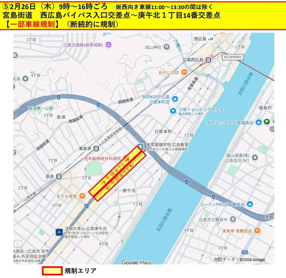 西区庚午北 国道2号宮島街道(一部車線規制)