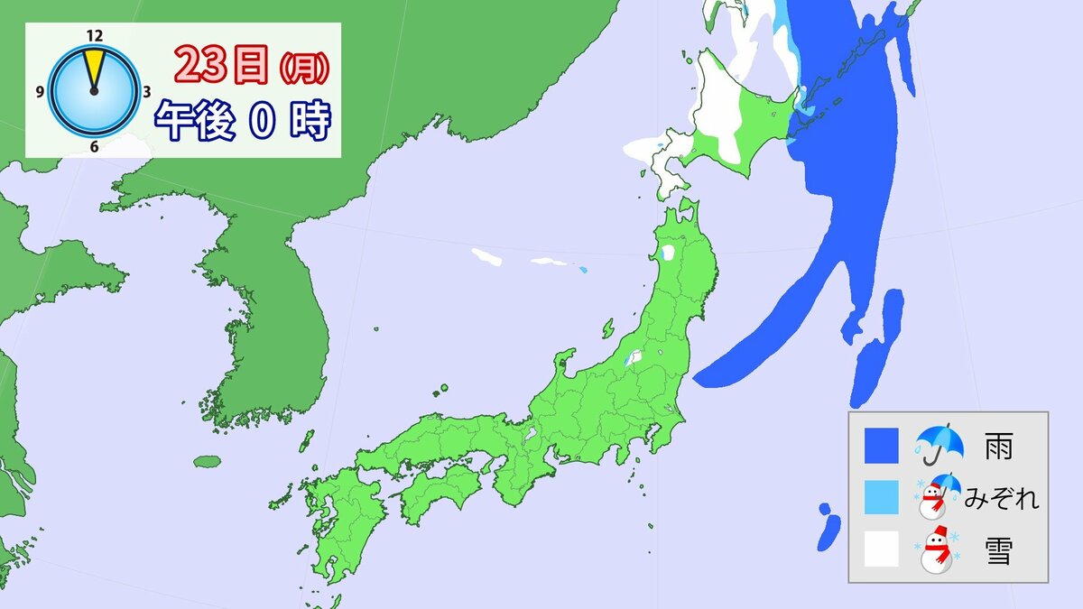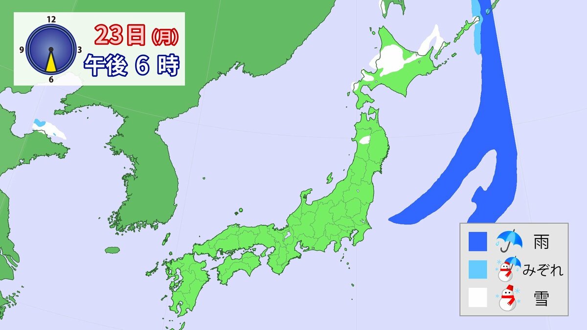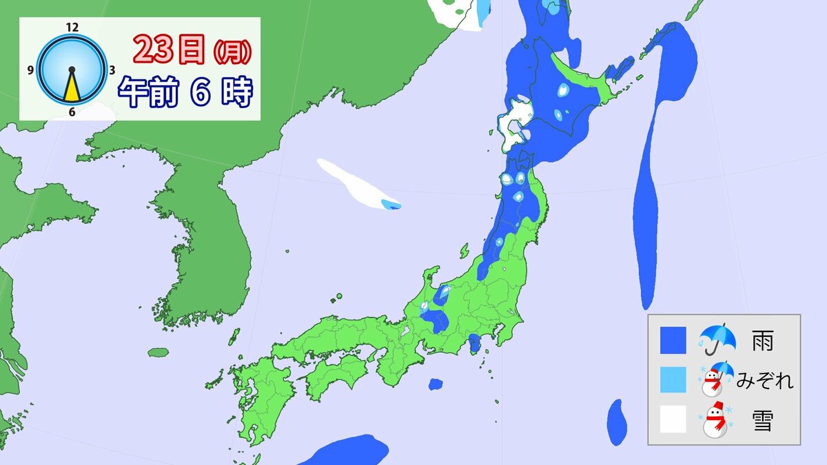 23⽇(月)は、前線が⽇本海から北⽇本付近を通過し、東日本や北日本では、雨や雪が降るでしょう。24⽇(火)から26日(木)頃は日本付近が気圧の谷となり、広い範囲で雨や雪が降る見込みです。