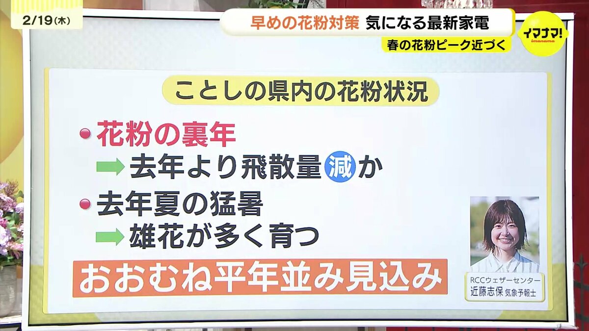 今年は花粉の裏年にあたり、去年よりは飛散量は減る見込みだが、去年夏の猛暑で雄花が多く育っている相殺されおおむね平年並みになる見込みです。県内はすでにスギ花粉が飛び始めているようで、花粉症対策は早め早めが必要ですね。