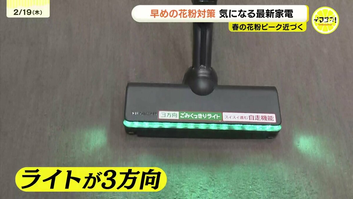 ARおそうじという機能で、家に持ち込んでしまった花粉や床に落ちているホコリをむら無く吸い取ることができます。またライトを3方向照らすことで、見えにくいゴミを浮かび上がらせるのだそうです。