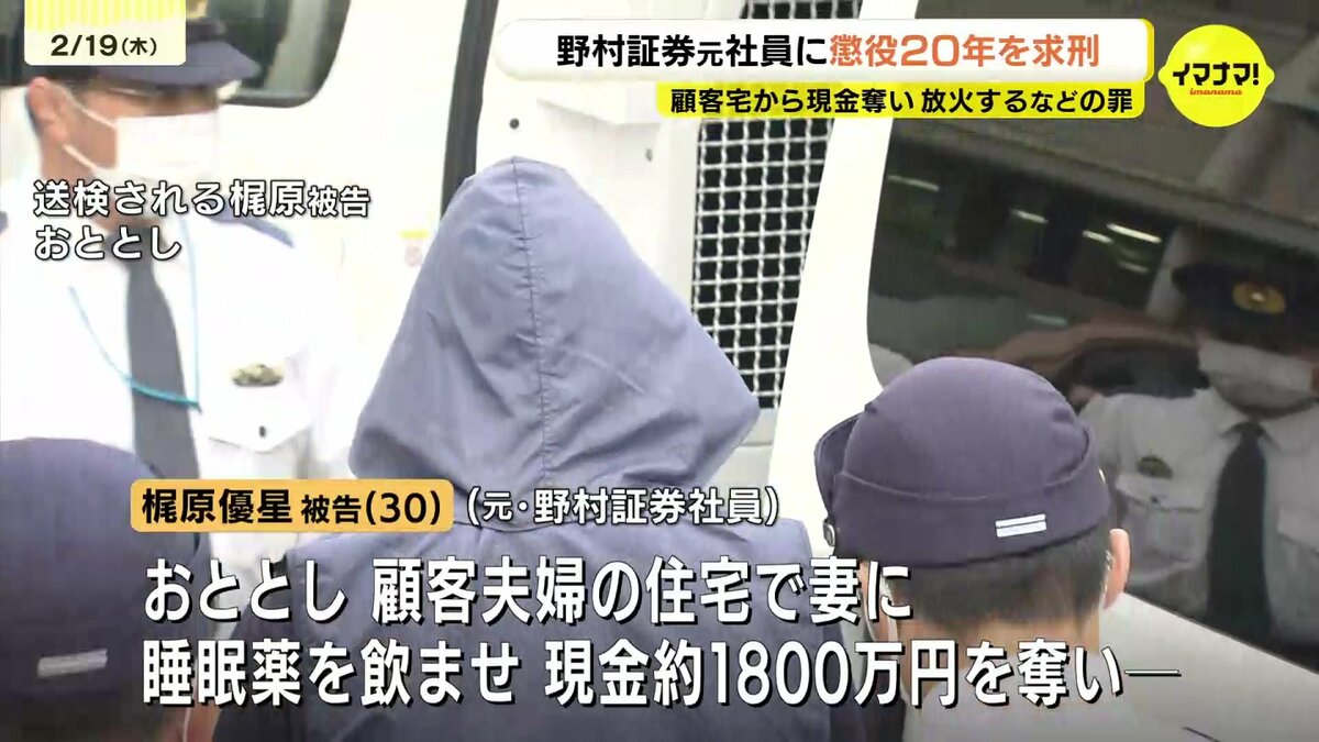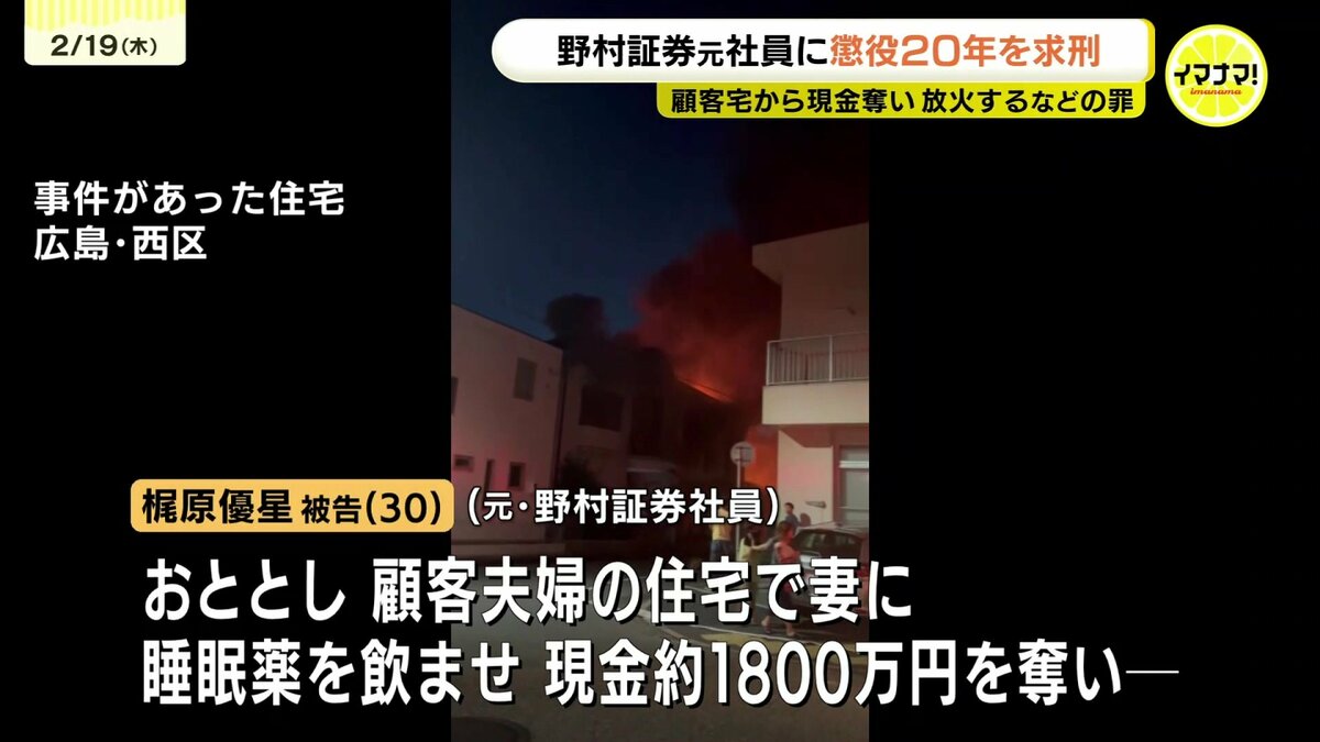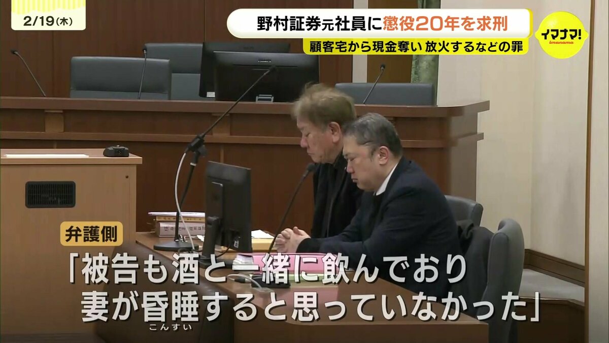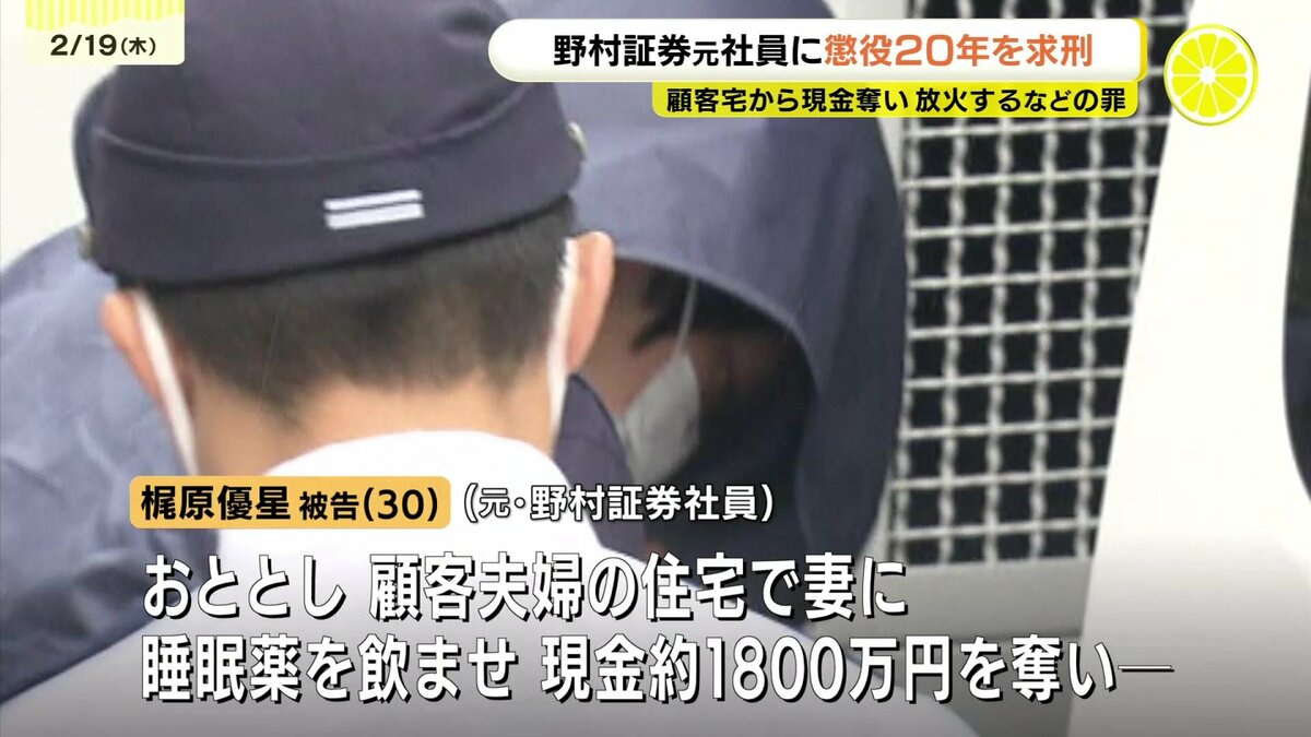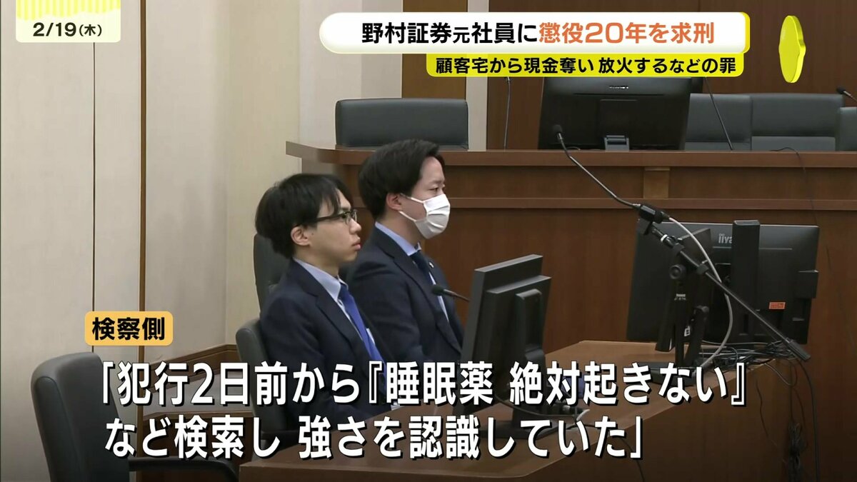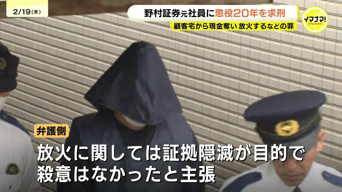 顧客の家から現金を奪った上、火を放って殺害しようとしたなどの罪に問われている野村証券の元社員の裁判員裁判で19日、検察側は懲役20年を求刑しました。
