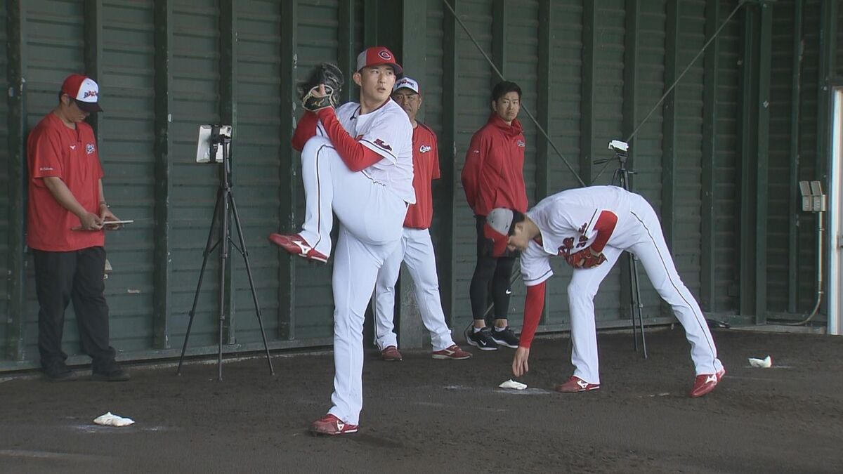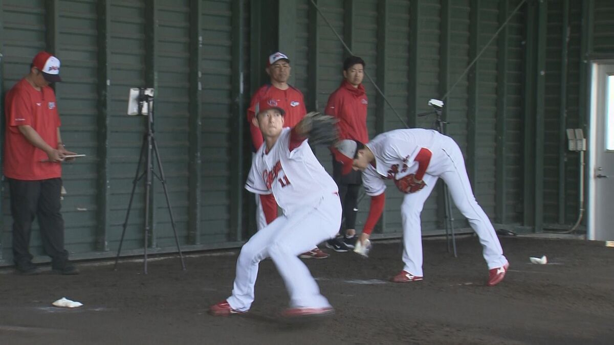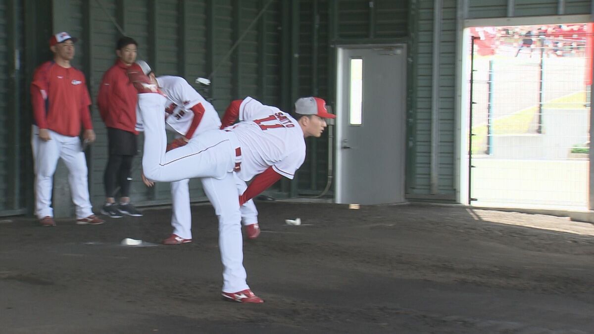 カープのドラフト2位右腕・齊藤汰直投手が20日、翌日に控えた横浜DeNAベイスターズとのオープン戦初戦に向け、ブルペンで調整を行いました。