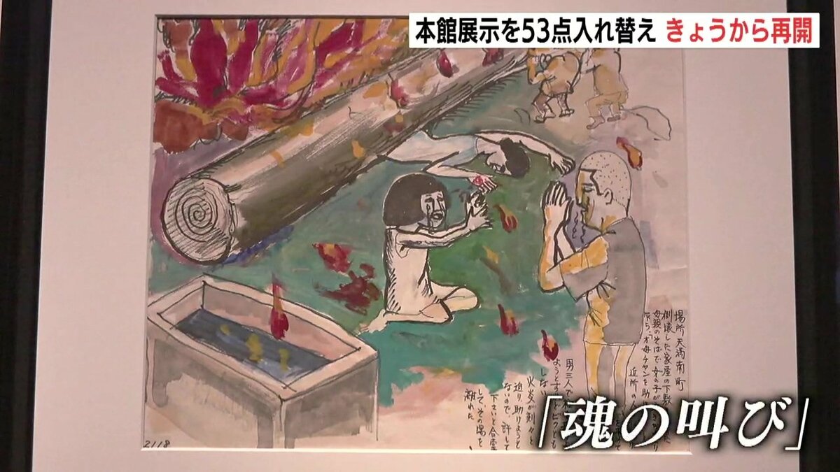 初日となった22日、原爆資料館にはたくさんの人が足を運んでいました。資料館では資料の劣化を防ぎ、収蔵品を展示する機会を増やすため、衣類や「原爆の絵」などを定期的に入れ替えています。作業に伴い、21日まで6日間休館し資料53点を入れ替えていました。建物疎開の作業中に亡くなった生徒たちの衣服や持ち物が並びます。「原爆の絵」は、「魂の叫び」をテーマに6点が入れ替えられました。