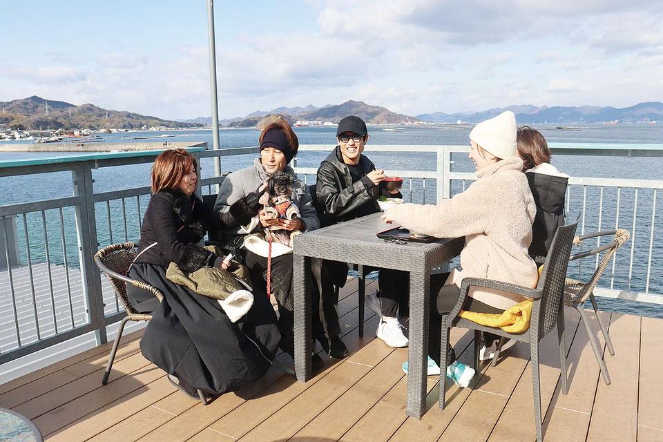 屋上にあるテラス席は、周囲の海を一望できる特等席!テーブルやソファが置かれ、寛ぎながら江田島グルメが満喫できる。
