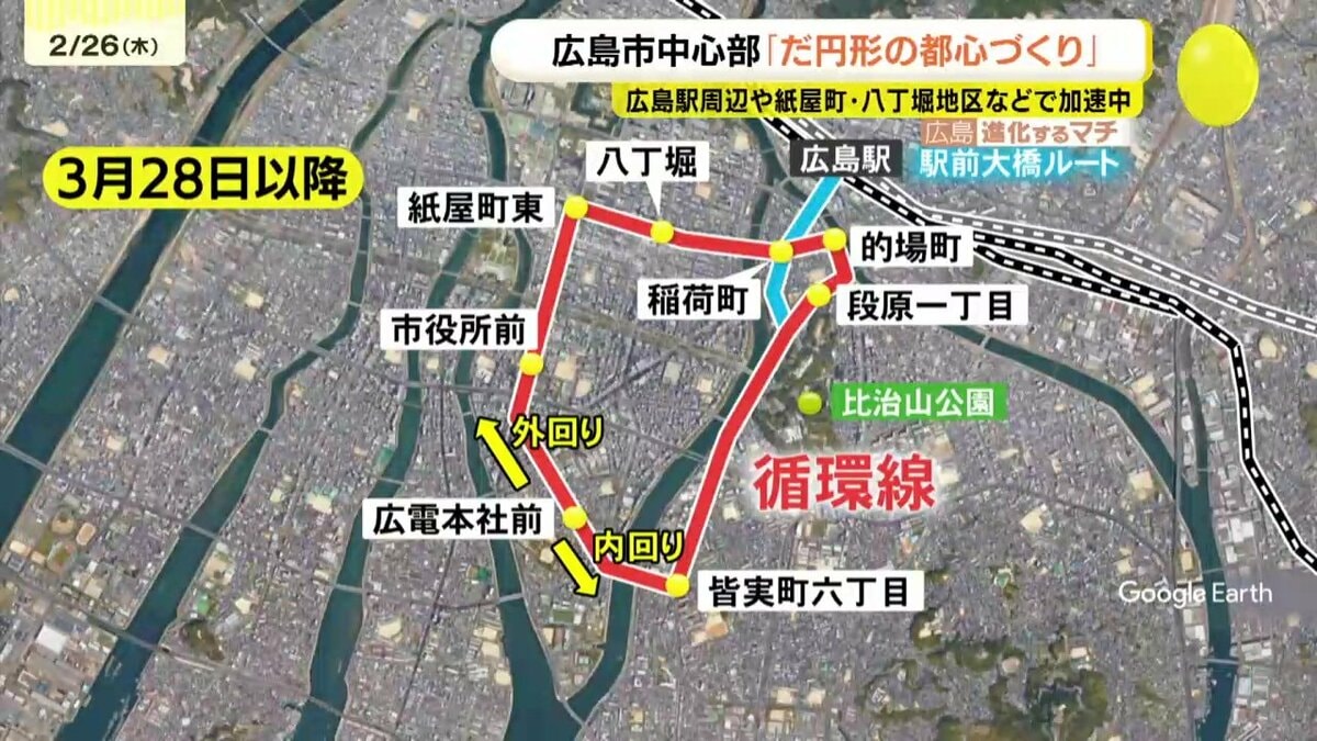路面電車にも、来月新たな系統が誕生します。3月28日、路面電車に「循環線」が開業。千田地区の広電本社前を起点に、平和公園に近い袋町や、商業施設の集まる八丁堀、現代美術館に近い比治山下電停などをぐるっとつなぎます。