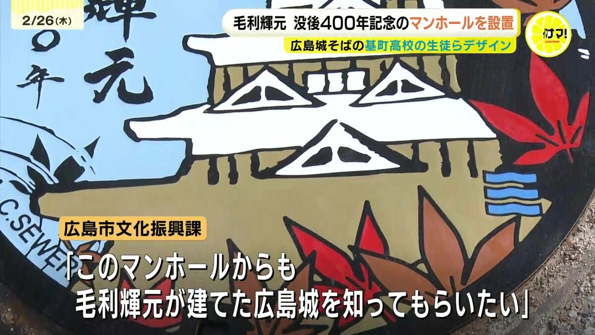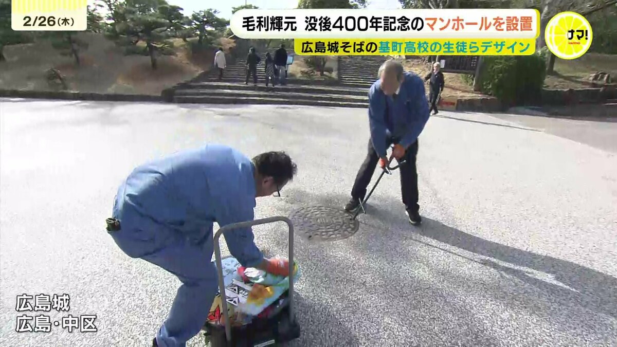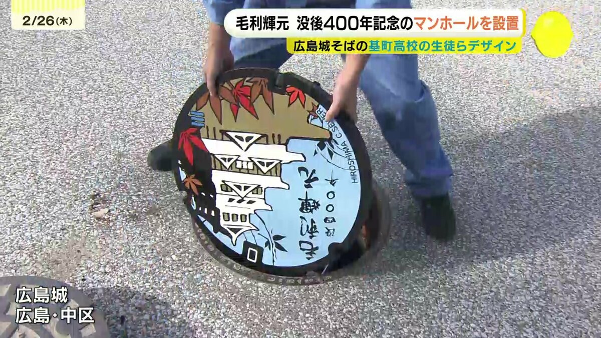 マンホールが設置されたのは、広島城がある公園内です。鋳鉄製で直径62センチの重さは41キロあります。マンホールは広島市の毛利輝元没後400年記念事業の一環で、城のすぐそばにある広島市立基町高校創造表現コースの生徒たちがデザインしました。