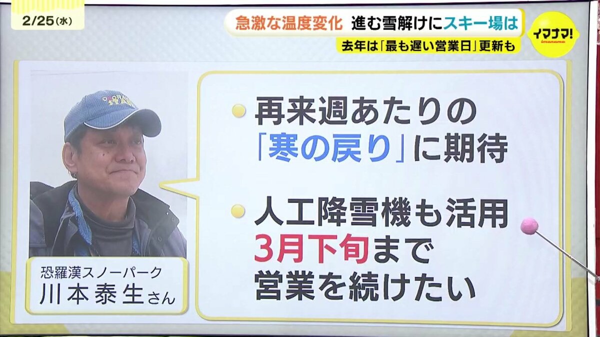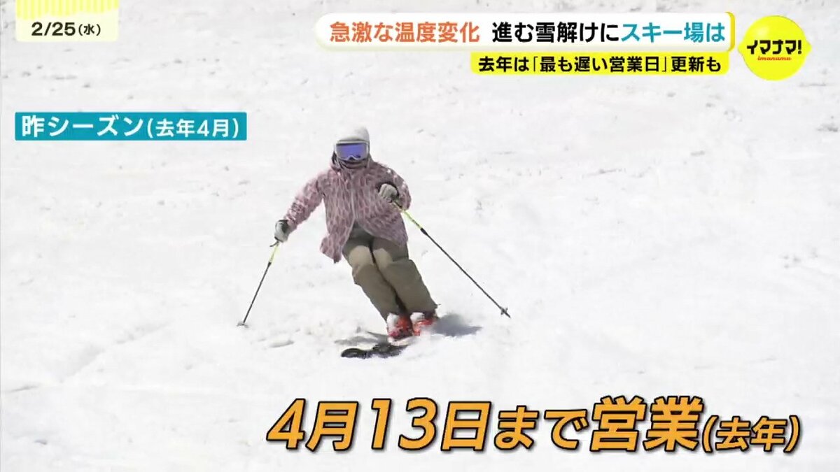 厳しい状況が続きますが、スキー場の川本さんは「再来週の寒の戻りに期待。人工降雪機をフル活用し、例年通り3月下旬までの営業を目指したい」と話し、春休みシーズンに向けた維持管理に全力を挙げるとしています。