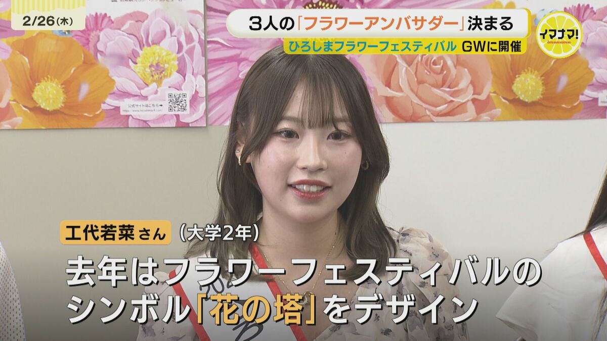 工代若菜さんは、広島市の大学に通う大学生で、25年はフラワーフェスティバルのシンボル「花の塔」をデザインしました。