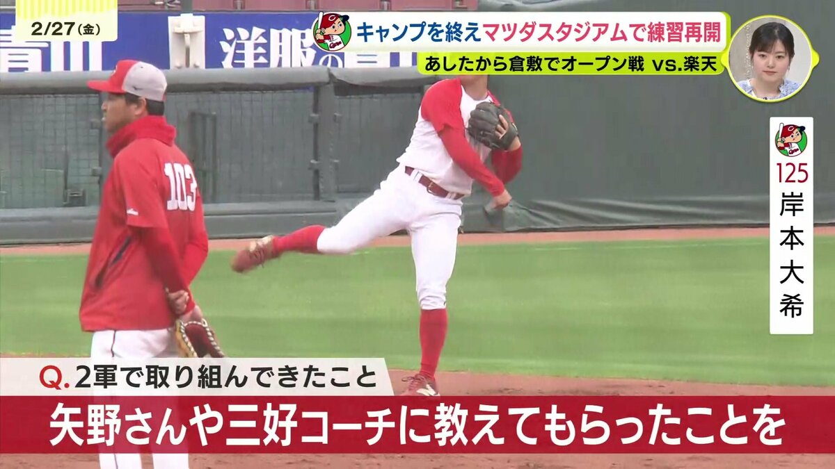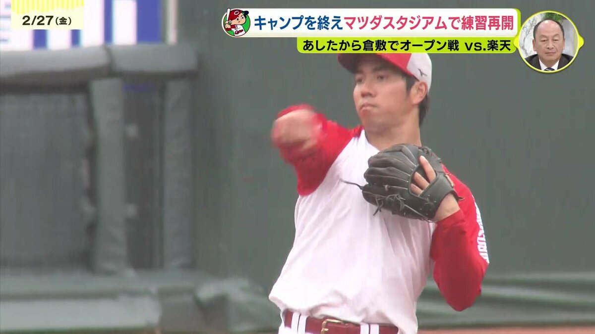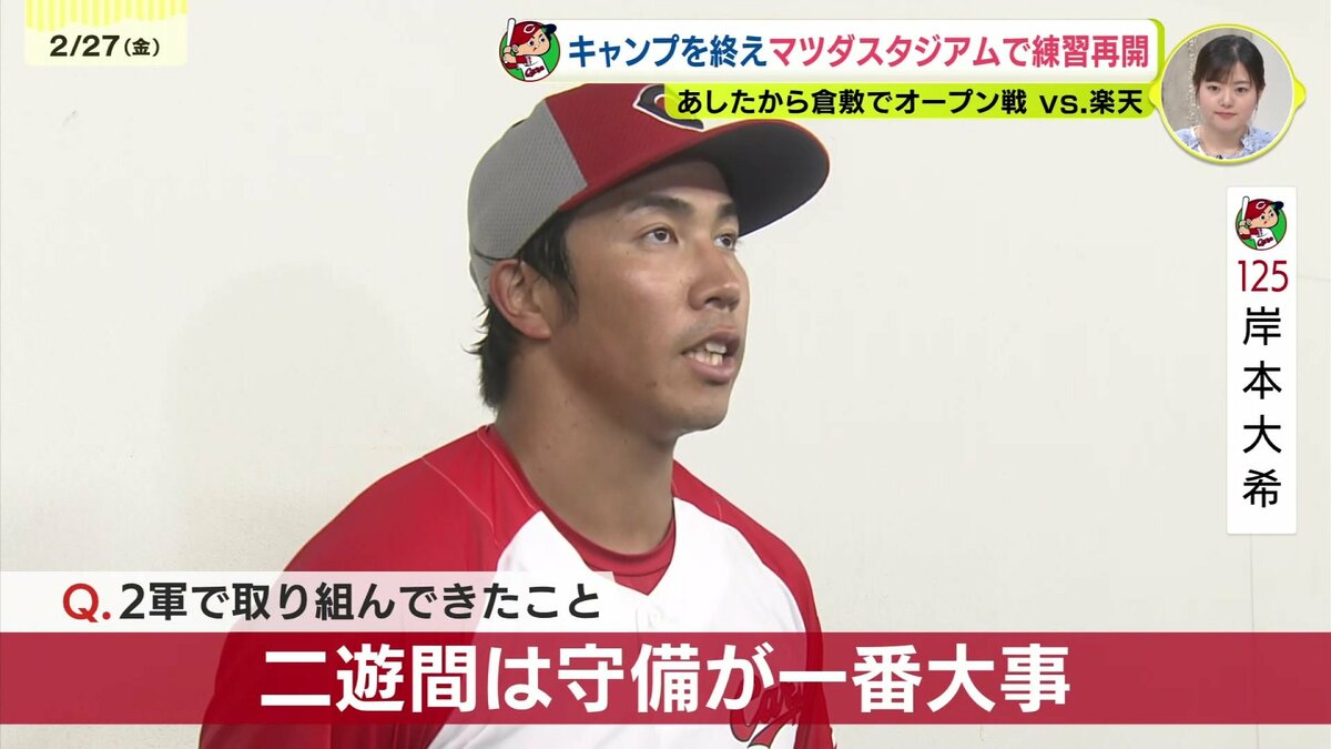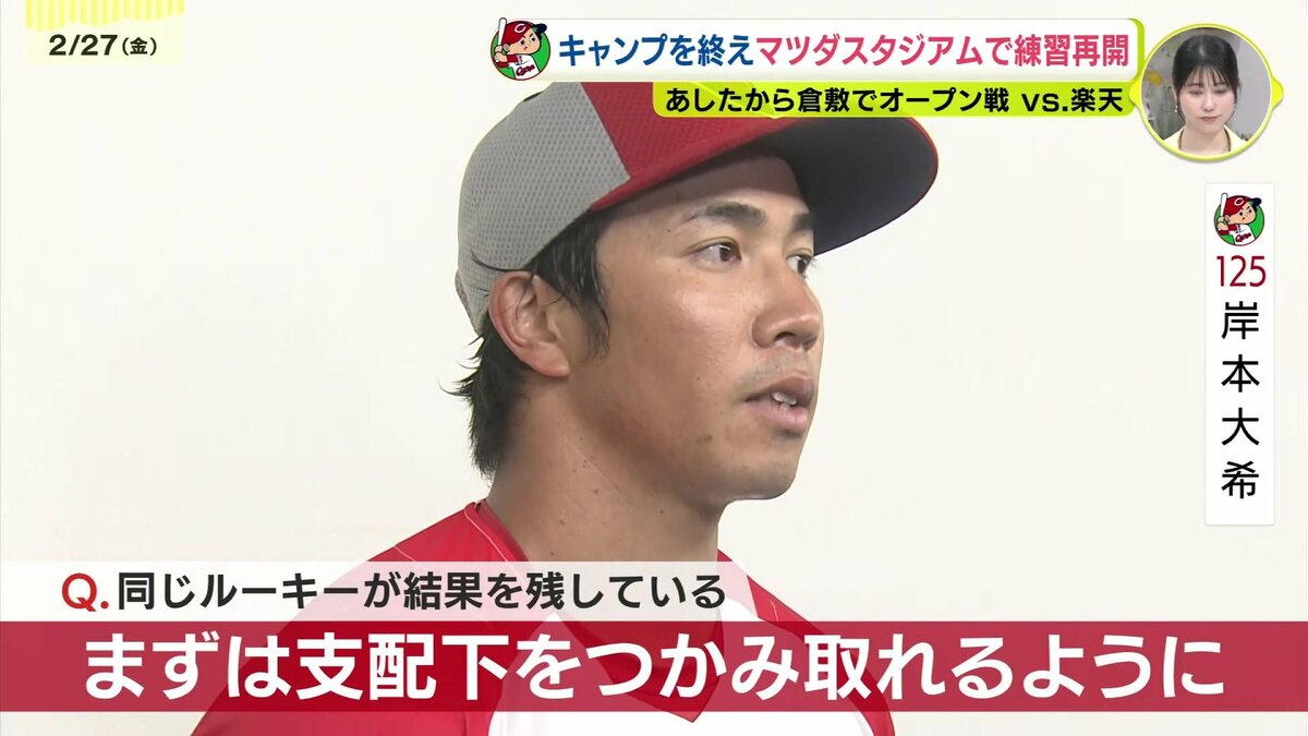 小雨が降りしきる中、合流初日のマツダスタジアムでの練習を終え、現在の心境と強化してきたポイント、明日28日から始まる倉敷での楽天とのオープン戦への意気込みを語りました。
