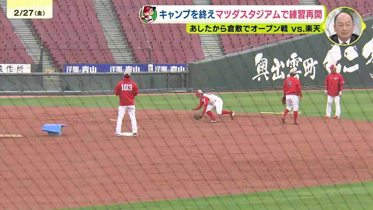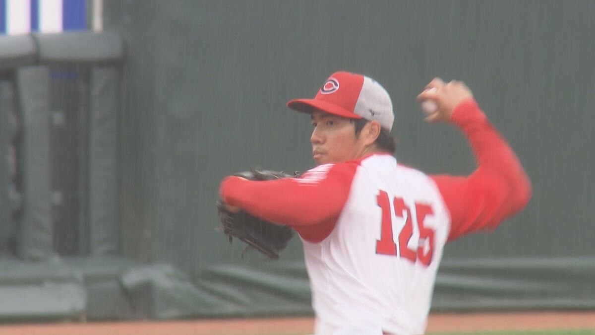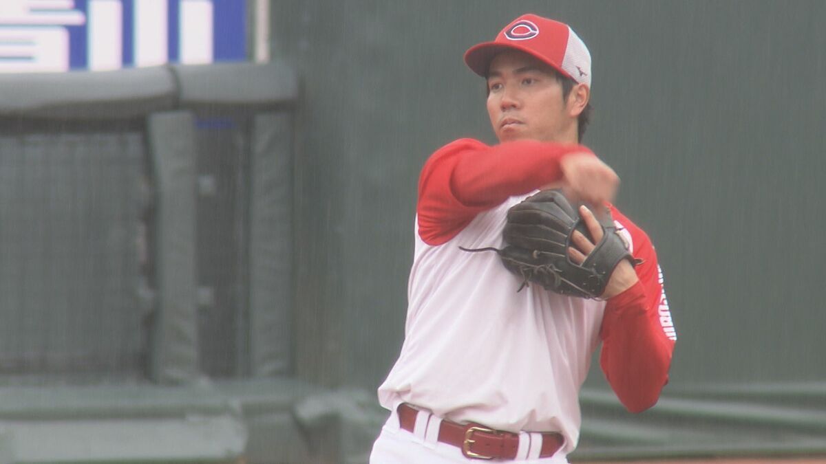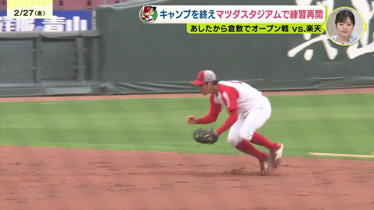 小雨が降りしきる中、合流初日のマツダスタジアムでの練習を終え、現在の心境と強化してきたポイント、明日28日から始まる倉敷での楽天とのオープン戦への意気込みを語りました。