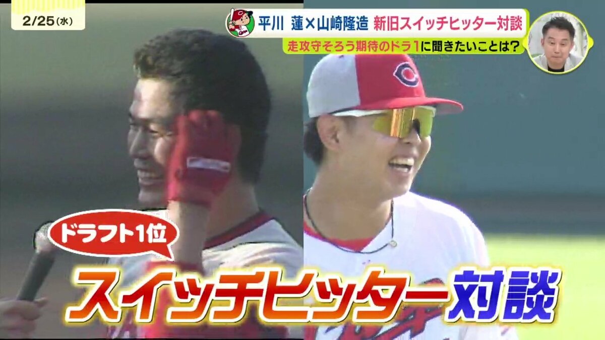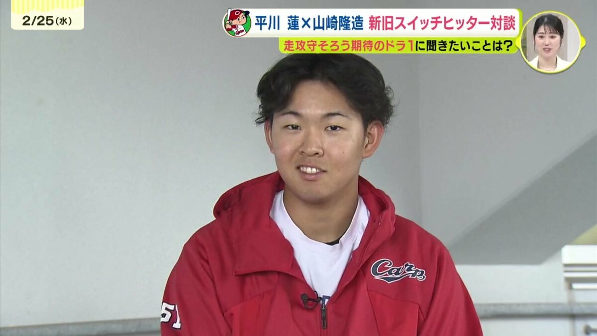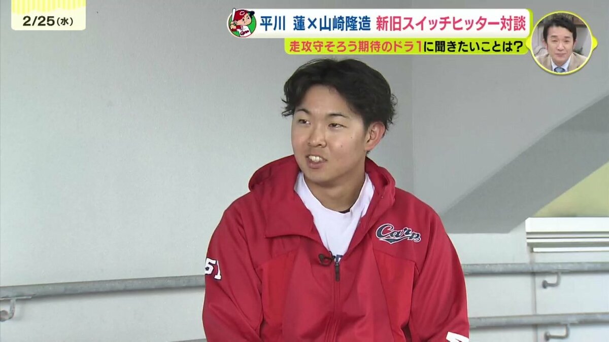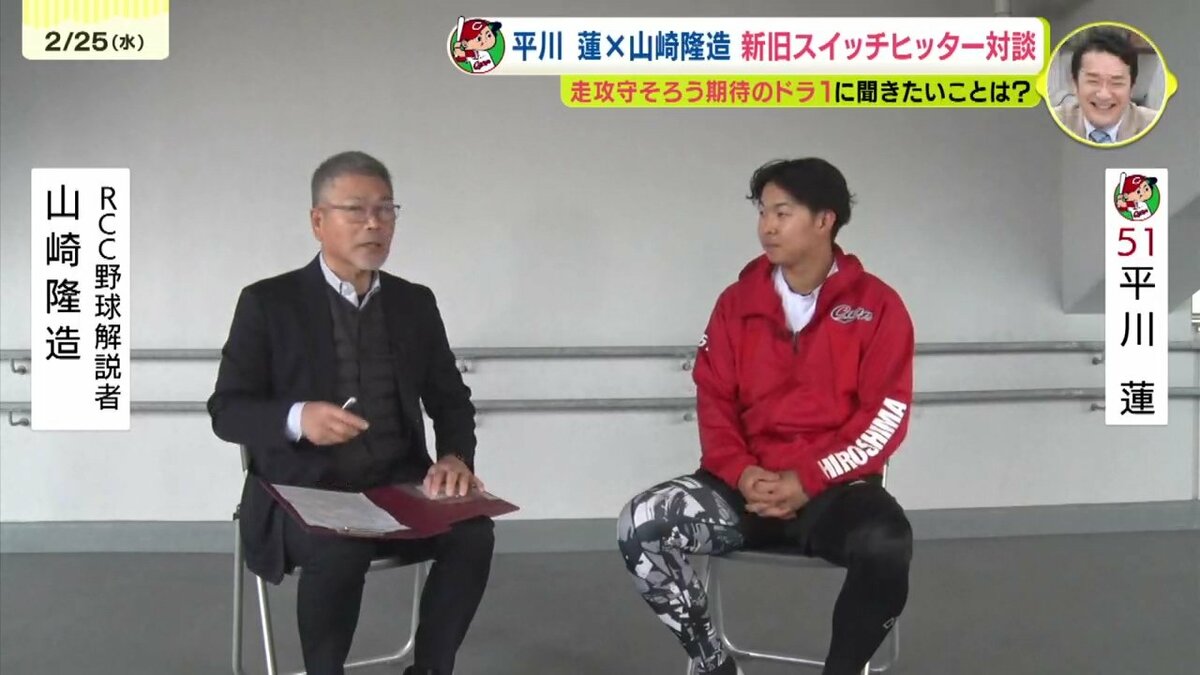 大型ルーキー・ドラフト1位の平川蓮選手とRCC野球解説者・山崎隆造さんの夢の対談が実現しました。この2人の共通点は、左右両打ちのスイッチヒッターということ。ことしのドラ1ルーキー・3割30本30盗塁のトリプルスリーを狙うスイッチヒッター平川蓮選手と1976年のドラフト1位、俊足を生かすためにプロ入り後に両打ちに転向し3度のベストナインという山崎隆造さん。ドラフト1位でカープに入り、ともにスイッチヒッターという2人の対談のゆくえは…!?(全3回の1回目です)