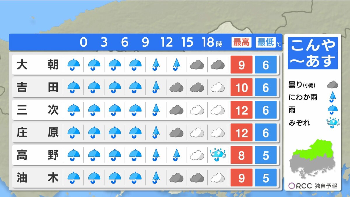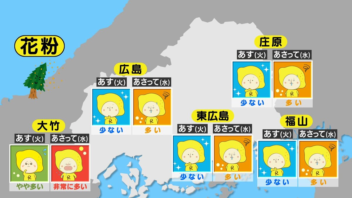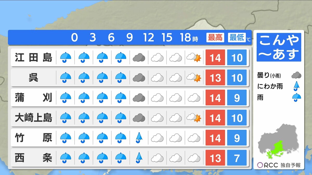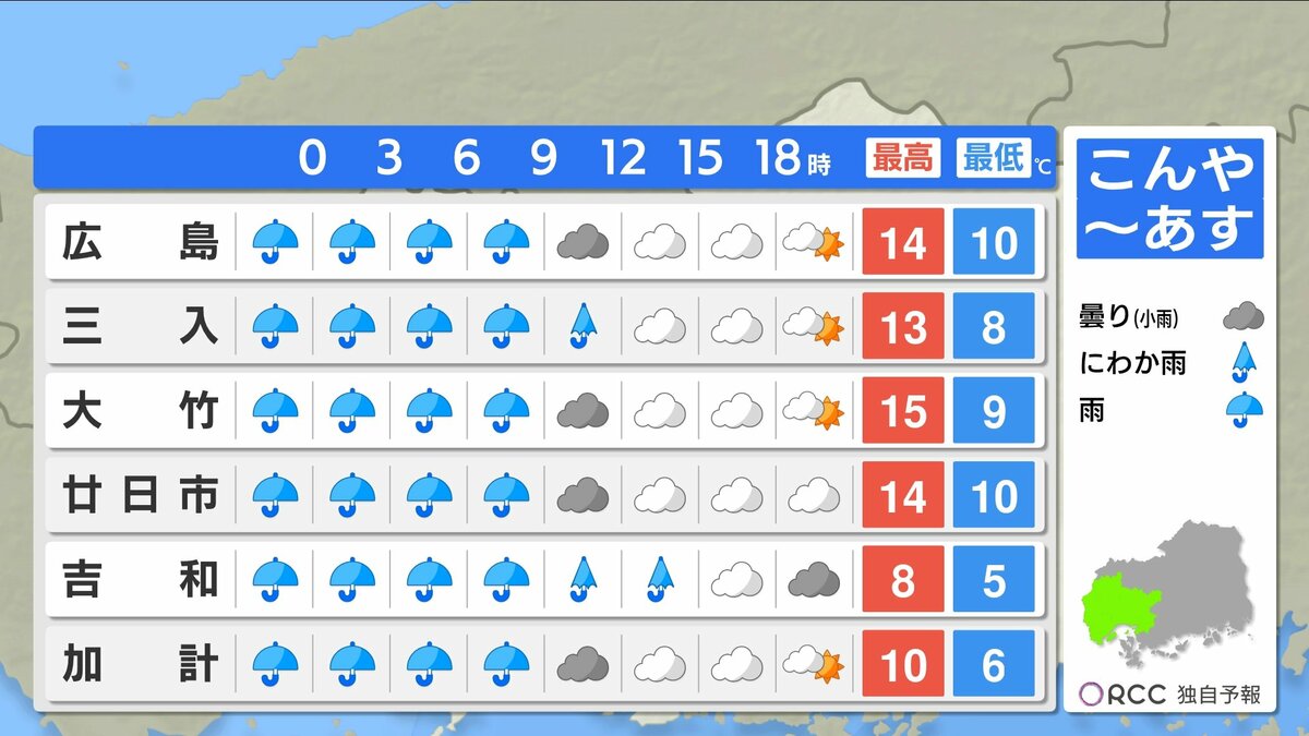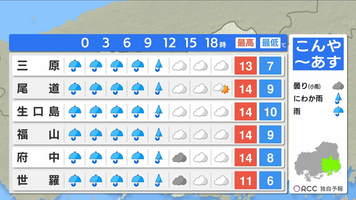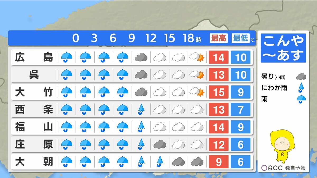きょう3月2日(月)の広島県内は、午後から雨が降り始め、夕方には雨エリアが拡大しました。日中の気温は平年より高めでしたが、空気が冷たく気温ほどの暖かさはあまり感じにくい一日でした。