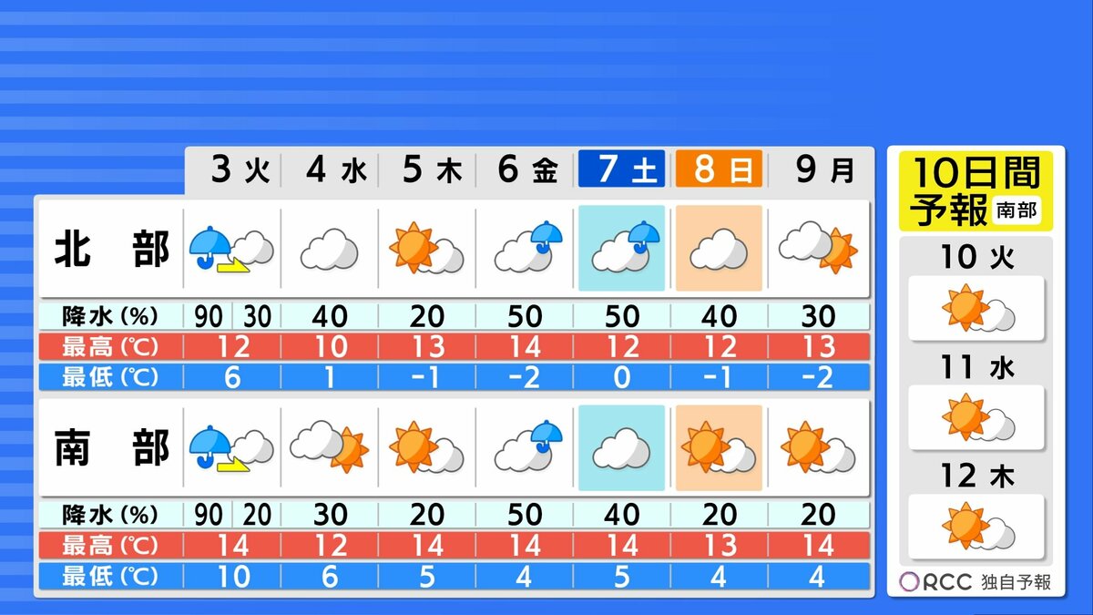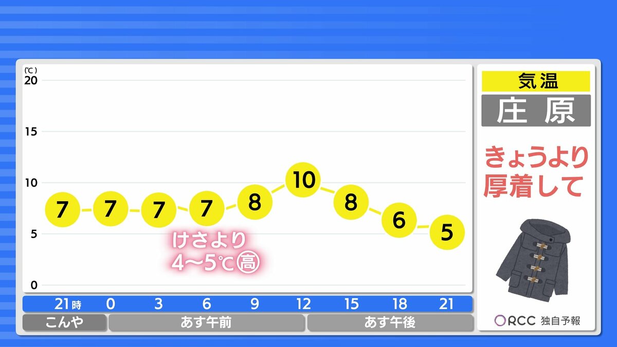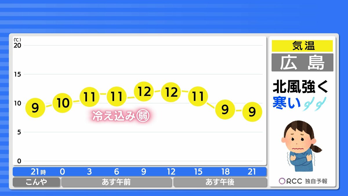 あす朝の冷え込みは沿岸部ではほとんど無いでしょう。日中の気温は沿岸部で15℃前後 平年より高いですが、北風が強く雨が降るため、日中もあまり暖かさは感じられず、肌寒くなるでしょう。きょうより厚着をした方が良さそうです。