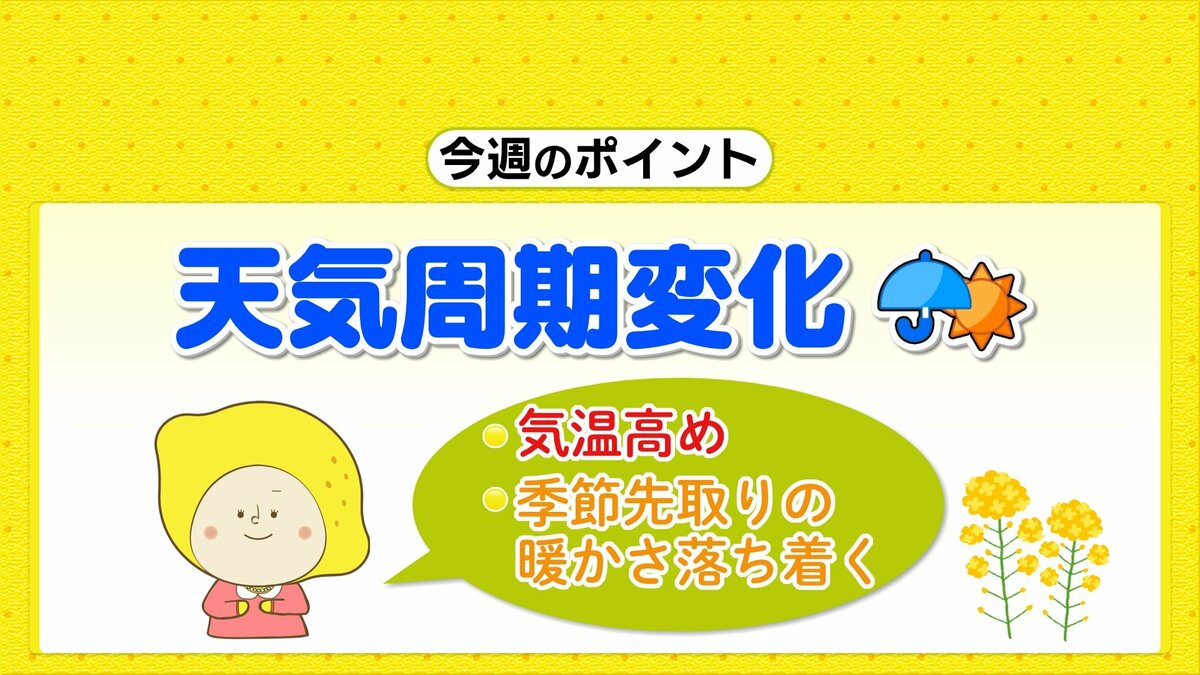 今週も周期的な天気変化になるでしょう。水曜日、木曜日は晴れ間が広がりますが、金曜日は再び下り坂で午後から土曜日の朝にかけて雨が降る見込みです。雨上がりは花粉の飛散量が増加するため対策をしっかりしてください。