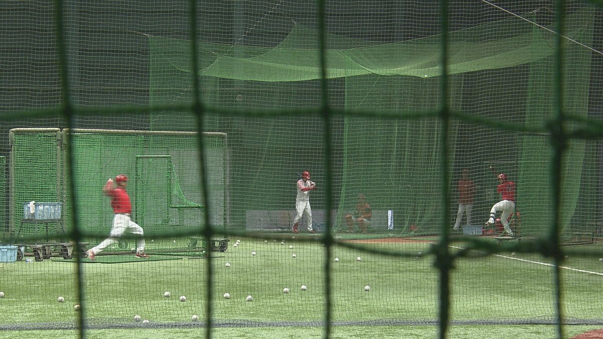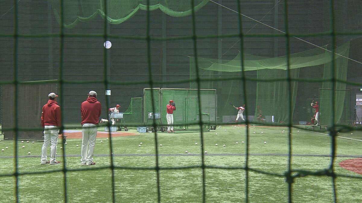 新井監督が見守る中、打撃練習を行う佐々木選手