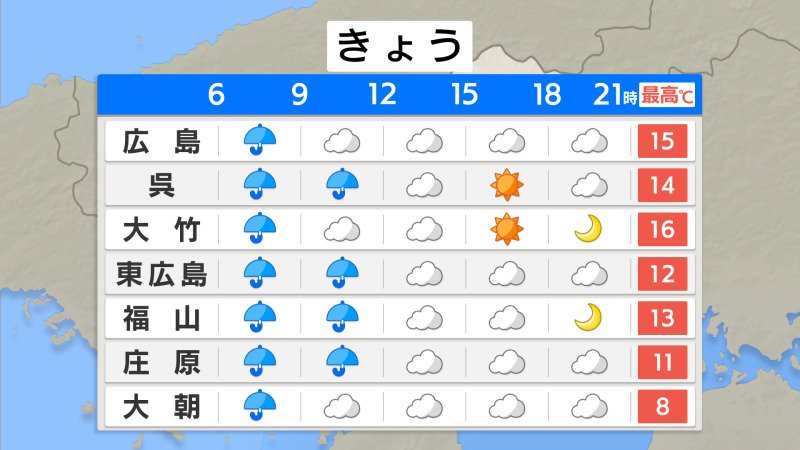 けさ(3日朝)の広島県内は、各地で雨が降っています。朝の冷え込みは弱く、最低気温は、広島市中区9.6℃・福山市11.7℃・庄原市7.4℃などでした。氷点下の地点はありませんでした。