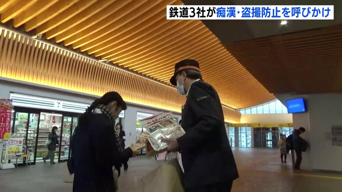 今回のテーマは「痴漢と盗撮の防止」…。新学期を迎えるにあたり、新たに鉄道を使う人が増える時期に、防犯への意識を高めてもらう目的があります。職員たちは、警察官らと共に通勤・通学客にチラシやティッシュを配布し、注意を呼びかけました。